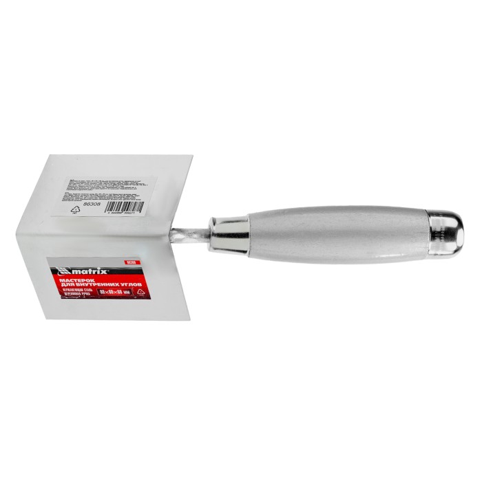 Мастерок Matrix 86308 из нержавеющей стали, размером 80 х 60 х 60 мм, с деревянной ручкой, имеет рабочее полотно в форме «книжки» и предназначен для формирования внутренних углов. С его помощью раствор наносится равномерно, поэтому углы получаются ровными и гладкими.ПреимуществаПрочность, стойкость к коррозии и химическому воздействию — рабочее полотно изготовлено из нержавеющей стали.Металлический затыльник — мастерком можно постукивать по кладке для более плотной усадки материалов.Удобная работа с быстрозастывающими штукатурками — к полотну с зеркальной полировкой не прилипает смесь.Высокое качество выполняемых работ — полотно продуманной геометрии не деформируется в процессе работы.Устойчивость к высоким нагрузкам — полотно и рукоятка надежно скреплены.Защита от разрушения — лакокрасочное покрытие предотвращает рассыхание рукоятки и предохраняет ее от воздействия влаги.Комфортная работа — инструмент весит всего 175 г, рукоятка из древесины приятна на ощупь.