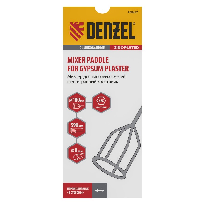 Оцинкованный миксер для гипсовых смесей Denzel 848427 диаметром 100 мм и длиной 590 мм, с шестигранным хвостовиком диаметром 8 мм — оснастка электроинструмента, которую применяют для перемешивания клеев, герметиков, зали...