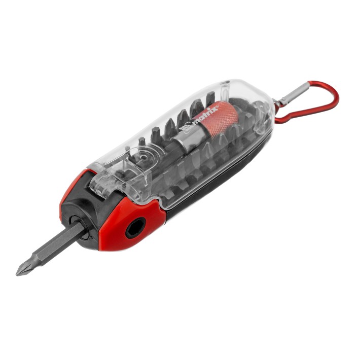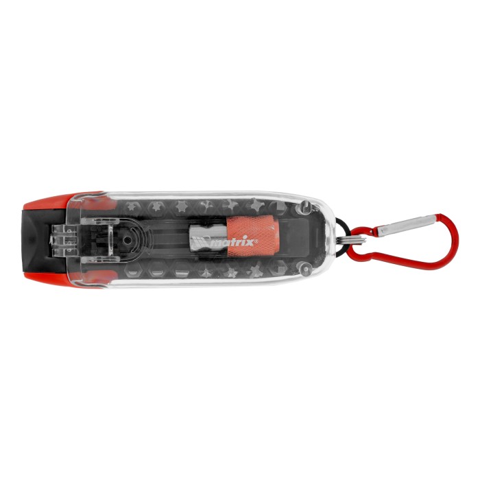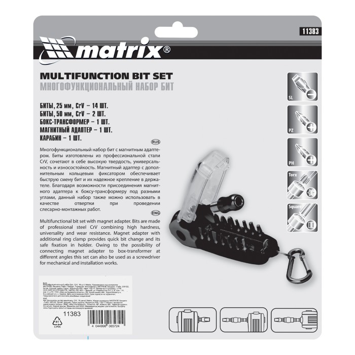 Многофункциональный набор Matrix 11383 включает 18 бит из стали CrV для шуруповертов, ручных и механических отверток. В комплект входит 14 бит разных типоразмеров длиной 25 мм и 2 удлиненные биты 50 мм для работ в труднодоступных местах. Они позволяют проводить монтажные/демонтажные работы с шурупами и саморезами, имеющими шлицы различного типа. Набор будет полезен для решения бытовых и профессиональных задач по сборке мебели и ремонту техники. ПреимуществаВысокий ресурс — биты изготовлены из прочной хромованадиевой стали.Магнитный адаптер с зажимным механизмом — биты надежно держатся без риска выпадения и быстро снимаются, что экономит время мастера.Коррозионная стойкость — на поверхность насадок нанесено защитное хромированное покрытие.Продуманная конструкция — благодаря встроенному присоединительному шестиграннику для битодержателя бокс при необходимости трансформируется в отвертку.Удобное хранение и транспортировка — биты поставляются в пластиковом боксе со съемным карабином для подвешивания на поясе.