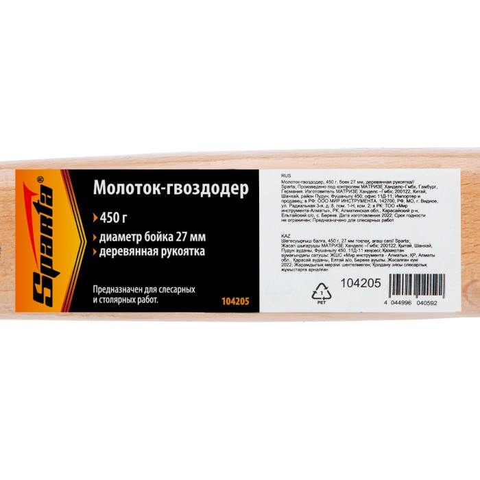 Молоток-гвоздодер Sparta 104205 с головкой весом 450 г и диаметром бойка 27 мм, с деревянной рукояткой, предназначен для слесарных, столярных и отделочных работ, будет полезен при сборке мебели. В носке головки имеется клиновидная прорезь, которая позволяет подцепить шляпку гвоздя. Поэтому молотком можно не только вбить крепеж, но и вытянуть неудачно забитый гвоздь.ПреимуществаПрочность и устойчивость к деформации — головка изготовлена из стали 45 и надежно закреплена при помощи двух клиньев.Устойчивость к трещинам и сколам — боек прошел селективную закалку, его твердость составляет 40-50 HRC.Продуманная конструкция — увеличенная «юбка» в месте входа рукояти в головку защищает рукоятку от повреждений в случае промаха по гвоздю.Долговечность — деревянная рукоятка покрыта бесцветным лаком для защиты от рассыхания.