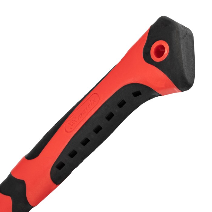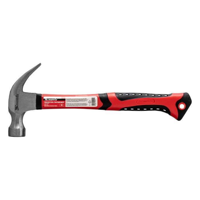 Молоток-гвоздодер Matrix 10450 длиной 330 мм, с головкой весом 450 г и диаметром бойка 27 мм, с фибергласовой обрезиненной рукояткой, — ударный инструмент, предназначенный для забивания крепежа Клиновидная прорезь позволяет подцеплять согнувшиеся гвозди для их выпрямления. Молоток будет полезен строителю, столяру, плотнику, сборщику мебели, а также пригодится для домашнего использования.ПреимуществаПрочность и долговечность — головка изготовлена из среднеуглеродистой стали 45, рабочие части прошли селективную закалку и устойчивы к образованию трещин и сколов.Устойчивость к ударным нагрузкам — твердость бойка составляет 40-50 HRC.Надежная конструкция — рукоятка зафиксирована при помощи эпоксидного клея, удлиненная область всада защищает ее от расшатывания и от ударов о гвоздь в случае промаха.Работа без ощущения усталости — фибергласовая рукоятка эффективно гасит колебания при отдаче.Эргономичность — рукоятка с резиновой накладкой не выскальзывает из руки, благодаря вентиляционным прорезям в ней ладонь не потеет.