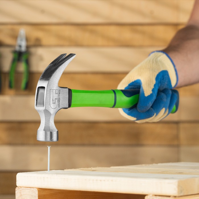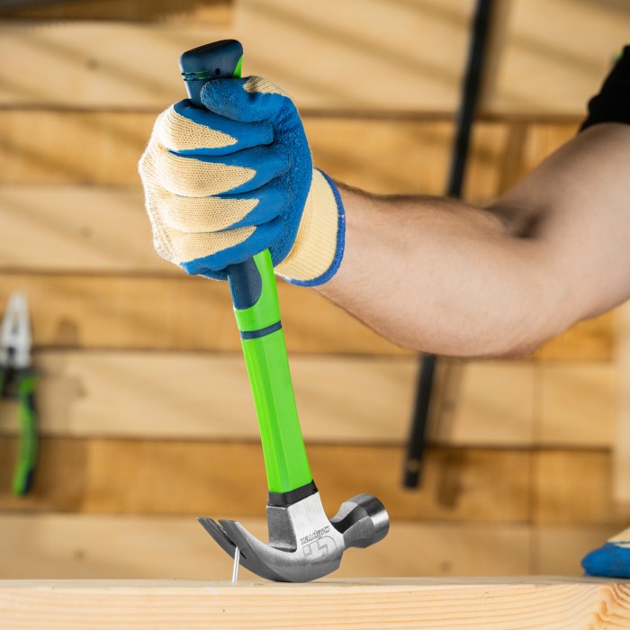 Молоток-гвоздодер Сибртех 10442 с головкой весом 450 г и фибергласовой обрезиненной рукояткой позволяет быстро и без усилий забивать гвозди, а также вытягивать согнувшиеся крепежные элементы при помощи изогнутого носка с прорезью для захвата шляпки. Инструмент пригодится во время строительства, отделочных работ, сборки мебели, а также будет полезен дома, в гараже или на даче.ПреимуществаПрочность и высокий ресурс — головка изготовлена из стали 45 и отфрезерована, боек закален до твердости 45-55 HRC на глубину 3 мм и устойчив к появлению сколов и трещин.Надежная конструкция — головка крепко держится на рукоятке, вклеенной при помощи специального эпоксидного клея, металлическая «юбка» в области всада защищает рукоятку от повреждений.Защита от коррозии — на рабочую часть молотка нанесено черное лаковое покрытие.Комфортная работа без ощущения усталости — фибергласовая обрезиненная рукоятка удобно лежит в руке и уменьшает отдачу.