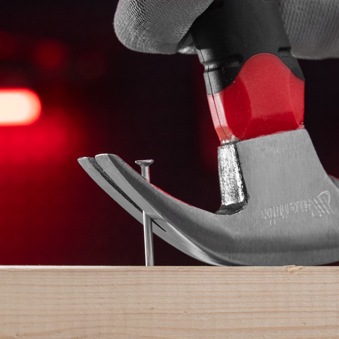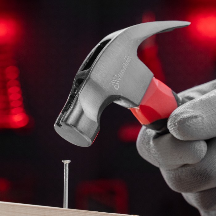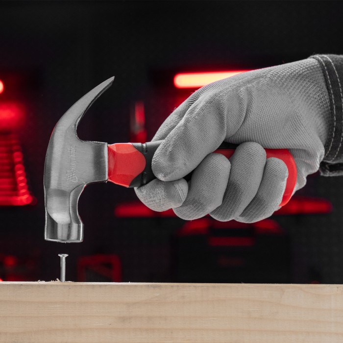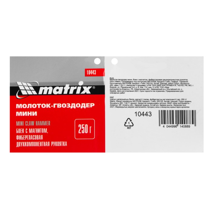 Молоток-гвоздодер мини Matrix 10443 с головкой весом 250 г, бойком с магнитом и фибергласовой двухкомпонентной рукояткой, предназначен для столярных, плотницких и отделочных работ. Благодаря компактным размерам он очень удобен в быту и в поездках. Круглый боек служит для забивания гвоздей, а плоский носок с прорезью — для их выпрямления. Магнитный фиксатор позволяет установить гвоздь в труднодоступном месте, не придерживая его рукой.ПреимуществаПрочность и высокий ресурс — головка изготовлена из среднеуглеродистой стали 45, боек закален до твердости 45-55 HRC на глубину 3 мм и устойчив к появлению сколов и трещин.Долговечность — головка отшлифована и имеет защитное покрытие для предотвращения коррозии.Надежная конструкция — головка крепко держится на рукоятке, вклеенной при помощи специального эпоксидного клея, увеличенная металлическая часть в области всада защищает рукоятку от повреждений.Комфортная работа без ощущения усталости — фибергласовая обрезиненная рукоятка поглощает колебания отдачи, а благодаря рифленой поверхности не выскальзывает из ладони.
