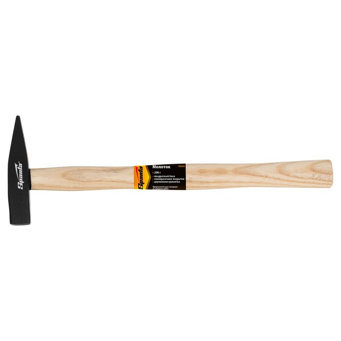 Слесарный молоток Sparta 102045 длиной 280 мм, с квадратным бойком весом 200 г и деревянной рукояткой, предназначен для нанесения ударов при работе с металлом и забивании гвоздей. Малый вес позволяет выполнять большой объем работ с мелким крепежом без усталости и потери точности. Заостренный с одного конца боек облегчает работу в труднодоступных местах. Молоток пригодится на строительной площадке, во время ремонта, сборки и установки мебели, а также будет полезен в домашнем хозяйстве.ПреимуществаПрочность — головка изготовлена из среднеуглеродистой стали 45 методом ковки и отфрезерована, рабочие части бойка закалены до твердости 40-45 HRC.Надежная фиксация головки — она закреплена на рукоятке путем расклинивания и дополнительно проклеена эпоксидным клеем.Защита от разрушения — головка покрыта черным лаком, бесцветное лаковое покрытие предохраняет рукоятку от рассыхания.Комфортная работа — гладкая деревянная рукоятка не выскальзывает из ладони.