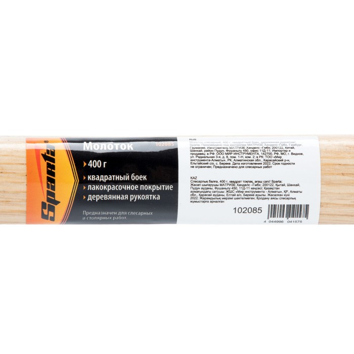 Слесарный молоток Sparta 102085 длиной 310 мм, с квадратным бойком весом 400 г и деревянной рукояткой, предназначен для нанесения ударов при работе с металлом и забивании гвоздей. Позволяет выполнять большой объем работ без усталости и потери точности. Заостренный с одного конца боек облегчает работу в труднодоступных местах. Молоток пригодится на строительной площадке, во время ремонта, сборки и установки мебели, а также будет полезен в домашнем хозяйстве.ПреимуществаПрочность — головка изготовлена из среднеуглеродистой стали 45 методом ковки и отфрезерована, рабочие части бойка закалены до твердости 40-45 HRC.Надежная фиксация головки — она закреплена на рукоятке путем расклинивания и дополнительно проклеена эпоксидным клеем.Защита от разрушения — головка покрыта черным лаком, бесцветное лаковое покрытие предохраняет рукоятку от рассыхания.Комфортная работа — гладкая деревянная рукоятка не выскальзывает из ладони.