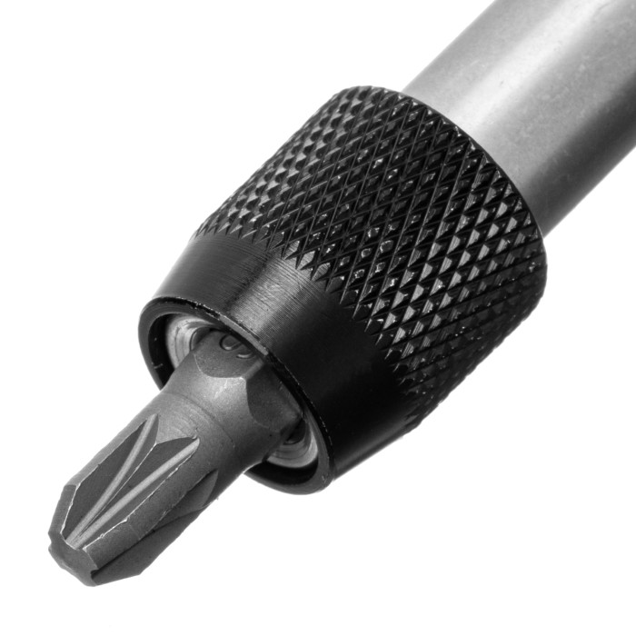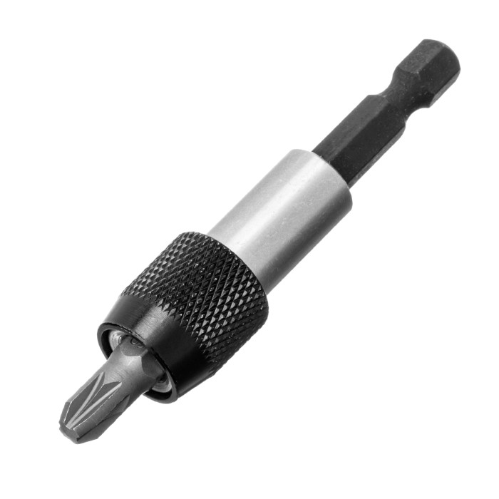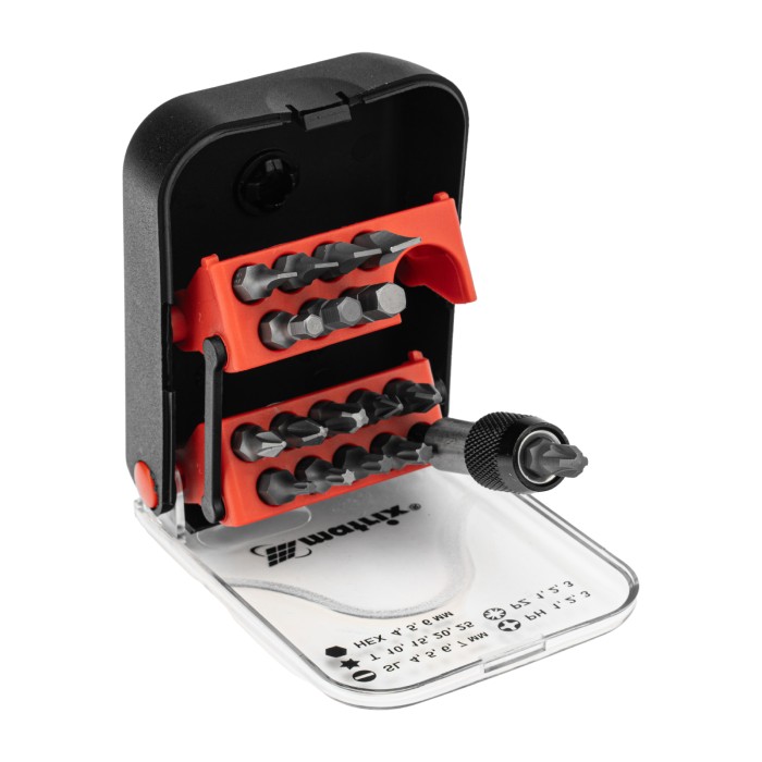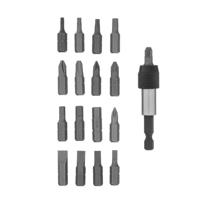 Пластиковый кейс - 1 штБиты: PH1, PH2, PH3, PZ1, PZ2, PZ3, SL4, SL5, SL6, SL7, T10, T15, T20, T25, H4, H5, H6 - 17 штБитодержатель с быстрозажимным механизмом - 1 штДержатель бит - 1 шт