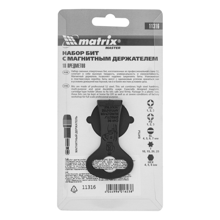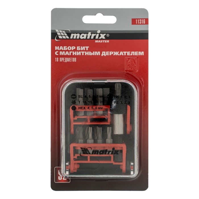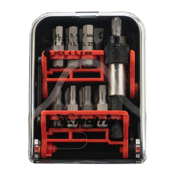 Набор Matrix 11316 включает 18 предметов из стали S2: биты и адаптер для бит, упакованные в пластиковый бокс. Подходит для шуруповертов, отверток для сменных бит и реверсивных отверток, и применяется для проведения монтажных/демонтажных работ с резьбовыми соединениями. В комплект входят биты следующих размеров: PH и PZ 1-3 мм, SL 4-7 мм, TORX 10 мм, 15 мм, 20 мм, 25 мм и HEX 4-6 мм. Набор будет полезен для ремонта техники, сборки мебели, пригодится дома, на даче и в гараже.ПреимуществаПрочность и износостойкость — биты изготовлены из инструментальной легированной стали S2.Магнитный адаптер — благодаря надежной фиксации насадок работать удобно даже в труднодоступных местах.Коррозионная стойкость — на биты нанесено защитное цинково-фосфатное покрытие.Надежная фиксация — быстрозажимной механизм крепко удерживает биту в адаптере.Удобное хранение и транспортировка — биты поставляются в прочном пластиковом кейсе с зажимом для крепления на ремень.