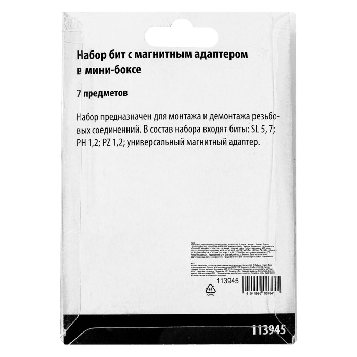 Набор бит Sparta 113945 в пластиковом боксе включает 7 предметов: 6 насадок типоразмеров SL, PH и PZ из стали 45X, длиной 25 мм, и магнитный адаптер. Биты с шестигранным хвостовиком 1/4 дюйма используются в качестве оснастки на шуруповертах, реверсивных и электрических отвертках для монтажа и демонтажа резьбовых соединений.ПреимуществаЛегкая установка оснасток — адаптер позволяет быстро менять биты без откручивания патрона.Надежная фиксация — благодаря встроенному магниту адаптер крепко удерживает биту.Коррозионная стойкость — на биты нанесено защитное фосфатированное покрытие.Эргономичность — в боксе имеется встроенный шестигранник для установки битодержателя.Удобное хранение и транспортировка — набор упакован в пластиковый бокс с зажимом для крепления на ремень.