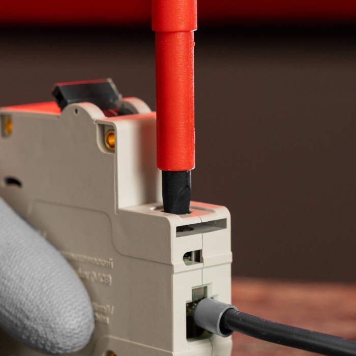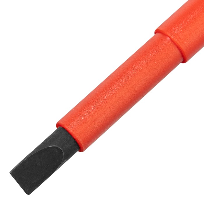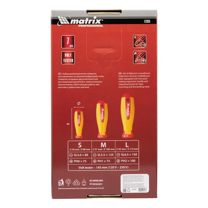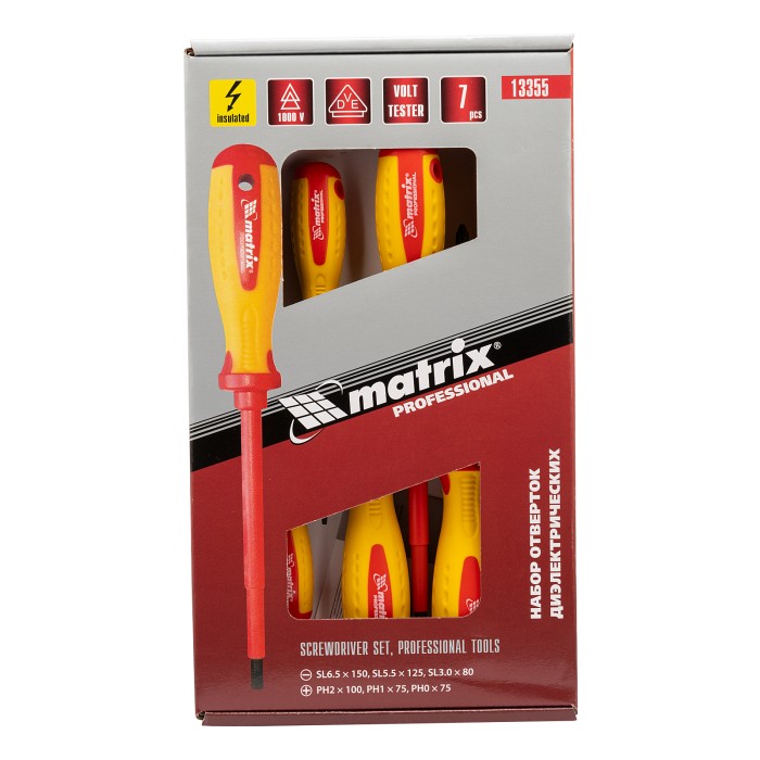 Набор диэлектрических отверток Matrix 13355 состоит из 7 предметов: 6 отверток с двухкомпонентными рукоятками, выдерживающих напряжение до 1000 В, и тестера до 250 В. Предназначен для проведения электромонтажных работ. Отвертки полностью покрыты изолирующим материалом, защищающим мастера от поражения электрическим током. Подходят для шлицев SL и PH. Входящий в комплект тестер позволяет быстро определить наличие напряжения в сети. Набор рекомендован для профессионального применения.,Важно — перед выполнением работ следует обесточить сеть либо отключить от нее прибор!ПреимуществаВысокая прочность — жала отверток выполнены из хромомолибденовой стали.Намагниченные жала — отвертки с насаженным крепежом можно направлять одной рукой, другой придерживая закрепляемую деталь.Долговечность — фосфатированные наконечники не боятся коррозии.Эргономичность — двухкомпонентные рукоятки не выскальзывают из ладони.Удобное хранение — в тыльной части рукояток имеются отверстия для подвешивания отверток на крючок или гвоздь.