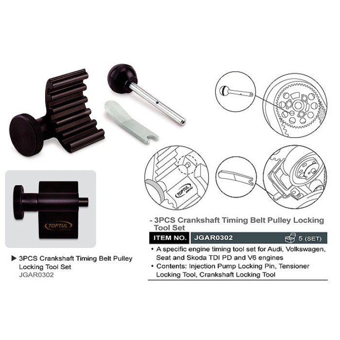 Набор для фиксации коленвала TOPTUL применяется при проведении ремонтных работ с TDI, PD и V6 двигателями Audi, Volkswagen, Seat и Skoda. В набор входят 3 предмета: стопорный штифт для фиксации шкива топливного насоса, -инструмент для фиксации ролика-натяжителя, -приспособление для фиксации коленвала.