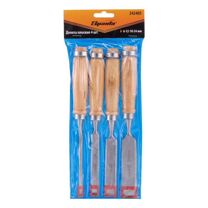 Набор плоских долот-стамесок Sparta 242405 размером 6-12-18-24 мм, с деревянными рукоятками, пригодится для выборки и зачистки пазов под врезные замки, снятия фасок, отделения стружки и других столярно-плотницких работ. ...