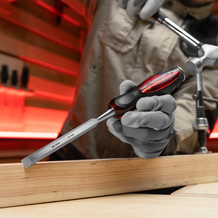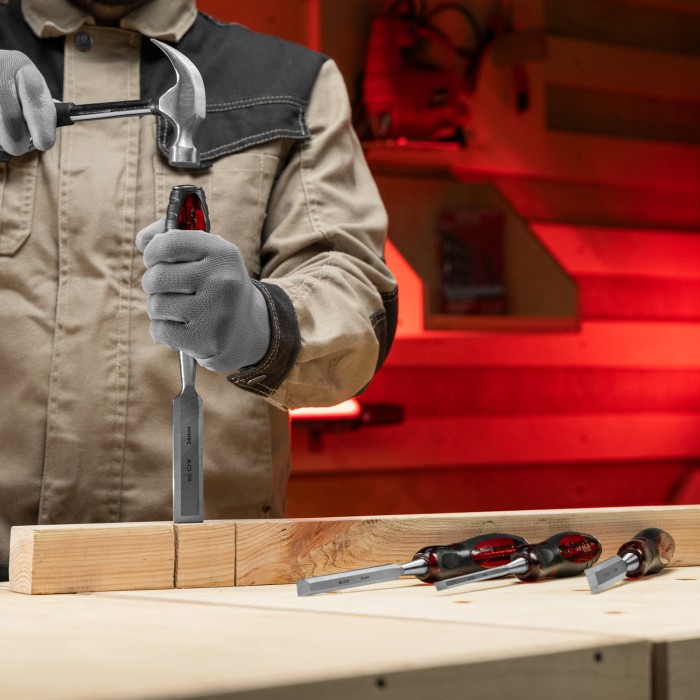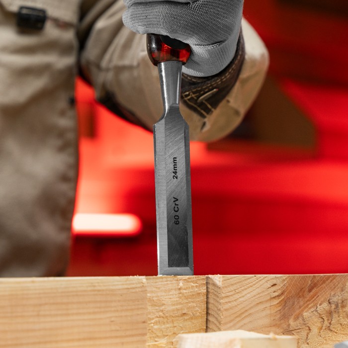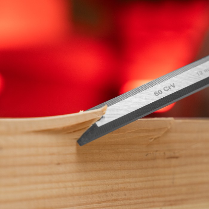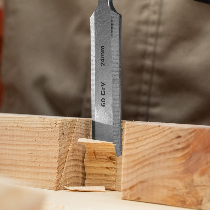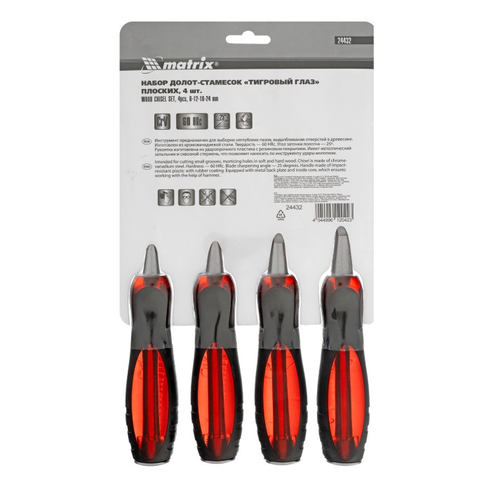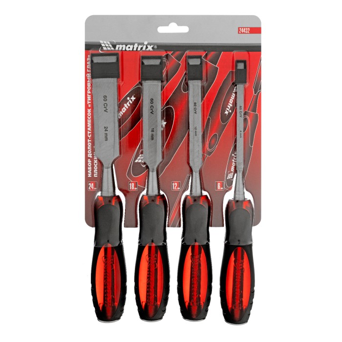 Набор долот-стамесок плоских Matrix «Тигровый глаз» 24432, 4 штуки размером 6-12-18-24 мм, используется для обработки древесины любых пород. Стамески позволяют выбирать пазы, проделывать выемки, снимать фаски, выдалбливать отверстия разной ширины. Рукоятки из ударопрочного пластика имеют металлический затыльник и выдерживают удары киянкой или молотком для легкого врезания в древесину любой твердости. Набор пригодится столярам, плотникам и мебельным мастерам.ПреимуществаПовышенная прочность — стамески из инструментальной легированной стали CrV имеют сквозной металлический стержень и легко выдерживают ударные нагрузки.Износостойкость — твердость 2/3 рабочей части полотна составляет 60 HRC, поэтому инструменты долго сохраняют эксплуатационные свойства.Высокая режущая способность — рабочие кромки заточены до бритвенной остроты под углом 20-35° и не требуют повторной заточки в течение 6-12 месяцев.Надежный хват — двухкомпонентные рукоятки из пластика и резины имеют рифленую поверхность и не выскальзывают из ладони.