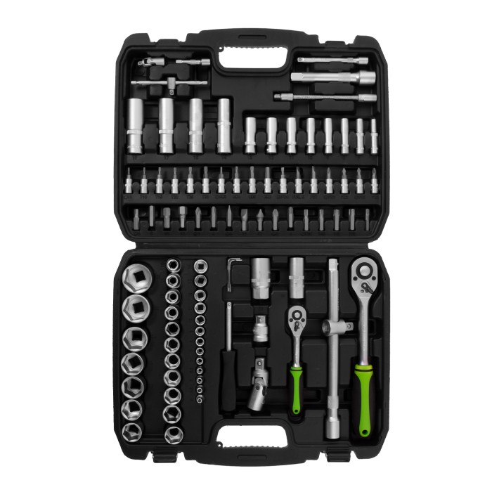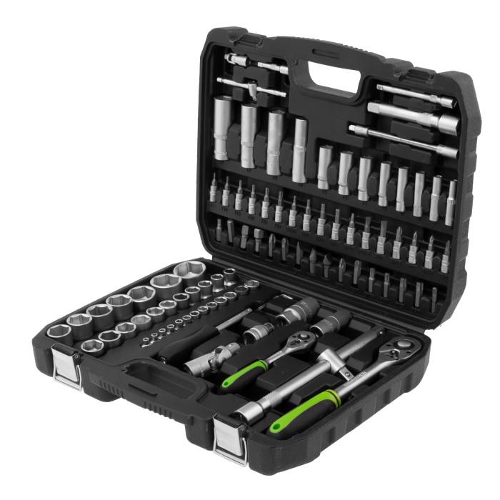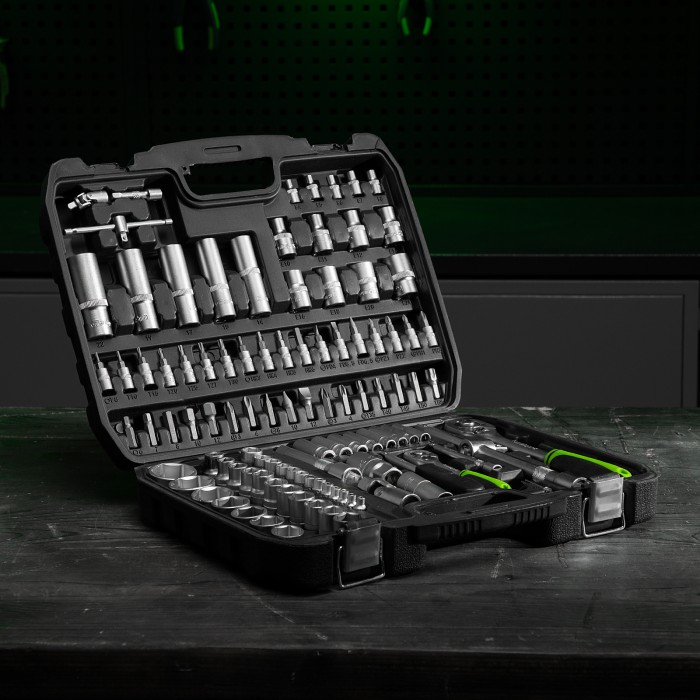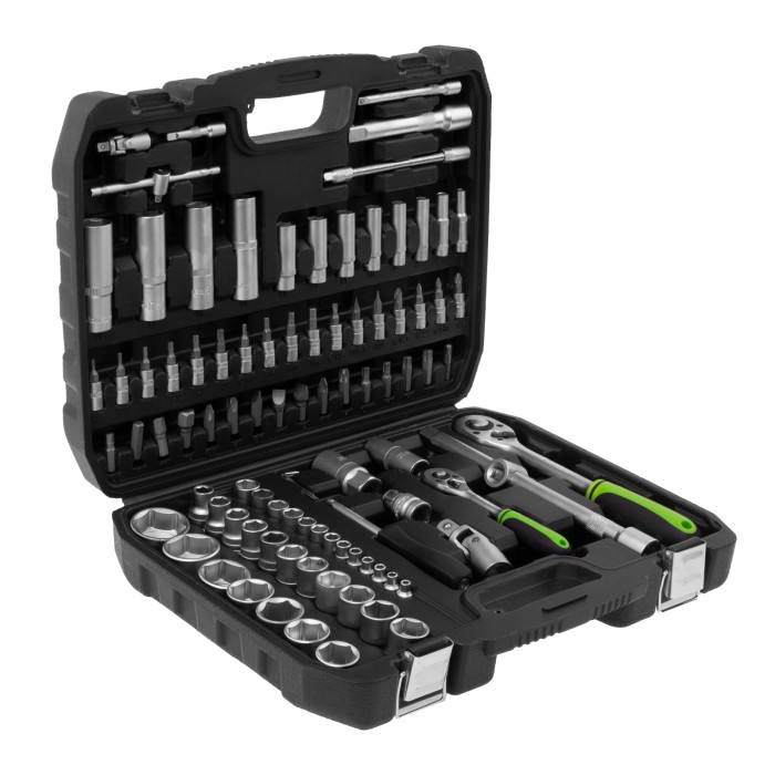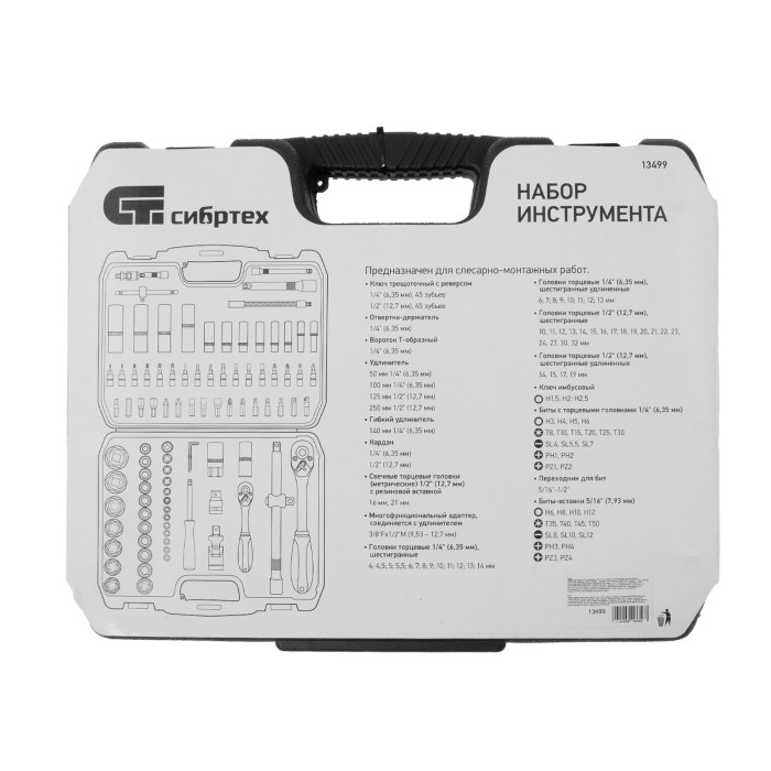 Набор инструмента Сибртех 13499 состоит из 94 предметов с присоединительными размерами 1/2" и 1/4", упакованных в пластиковый кейс. Предназначен для ремонта и обслуживания автомобилей, а также выполнения бытовых работ. Имеющиеся в комплекте насадки рассчитаны на крепеж с различными типами профилей и шлицев, включая HEX и TORX. Набор будет полезен автолюбителю и профессиональному мастеру.ПреимуществаПрочность — все элементы набора изготовлены из инструментальной стали и выдерживают активное использование.Защита от разрушения — инструменты имеют матовое антикоррозийное покрытие, увеличивающее срок их службы.Быстрый переход от монтажа к демонтажу — флажковые переключатели на трещоточных ключах позволяют мгновенно менять направление вращения.Комфортная работа в ограниченном пространстве — шаг трещоток с 45 зубцами составляет всего 8°.Удобная работа в труднодоступных местах — в набор входят удлинители, карданы и удлиненные торцевые головки.Продуманное хранение и транспортировка — набор упакован в кейс из ударопрочного пластика, закрывающийся на металлические застежки.