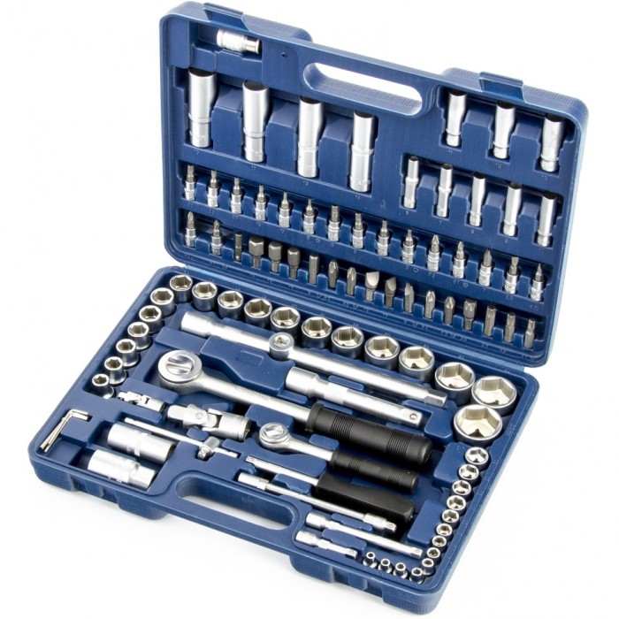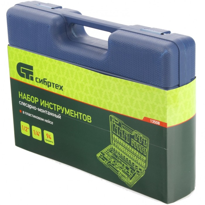 Набор инструментов Сибртех 13508 с присоединительными размерами 1/2 и 1/4 дюйма содержит 94 предмета для проведения слесарно-монтажных работ. С его помощью можно отремонтировать автомобиль без обращения в специализированный сервис, а также решить несложные бытовые задачи дома или на даче. Комплект поставляется в кейсе с транспортировочной ручкой, удобном для размещения в багажнике авто.ПреимуществаВысокая прочность — все элементы набора выполнены из инструментальной стали, рабочие части закалены до твердости 41 HRC.Защита от разрушения — на поверхность инструментов нанесено антикоррозийное матовое покрытие.Удобная работа одной рукой — трещотка оборудована переключателем с насечкой.Кейс из противоударного пластика — набор можно перевозить и хранить без риска потери и поломки инструментов.Быстрый поиск необходимого инструмента — номера ключей, бит и торцевых головок указаны на ложементе кейса.