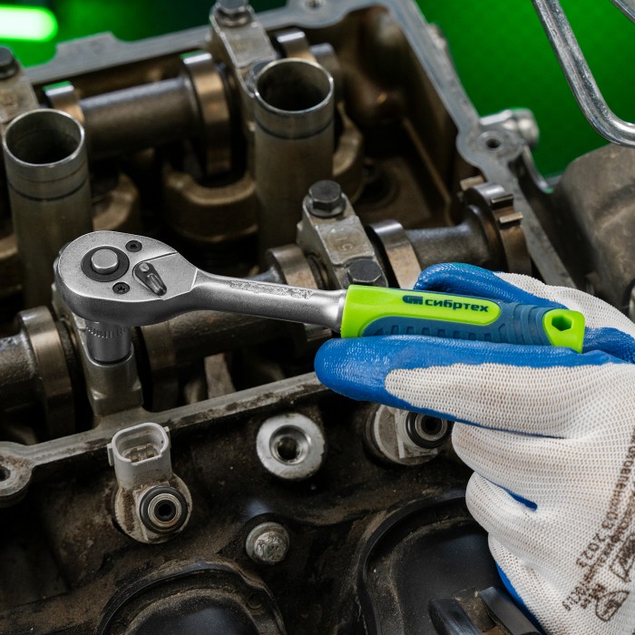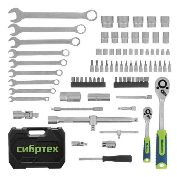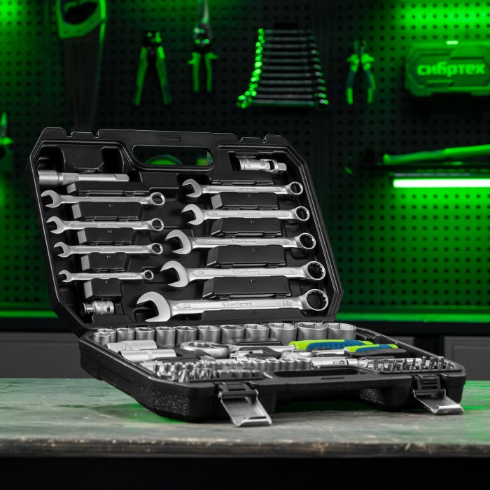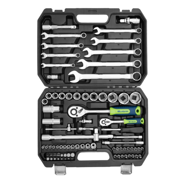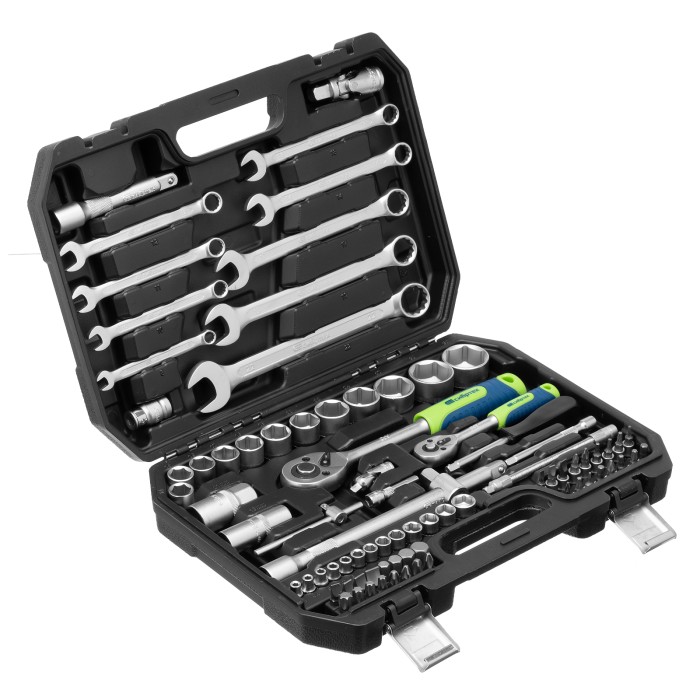 Набор инструментов Сибртех 13391 упакован в пластиковый кейс и состоит из 82 предметов с присоединительным размером 1/2" и 1/4", предназначенных для слесарных работ, преимущественно монтажа и демонтажа резьбового крепежа с разными типами шлицев. В комплект поставки входят карданы, удлинители и переходники, облегчающие работу в труднодоступных местах. Набор используется для ремонта автомобилей, а также полезен в быту.ПреимуществаИзносостойкость — элементы набора изготовлены из высокопрочной стали.Надежная защита от коррозии — на инструменты нанесено матовое хромовое покрытие.Комфортная и эффективная работа — ключи-трещотки с 45 зубьями оснащены механизмом быстрого сброса, переключателем реверса с металлическим флажком и двухкомпонентной рукояткой.Прочная фиксация — шариковый замок на трещотках, воротках, шарнирах и удлинителях надежно удерживает головки.Удобное хранение и транспортировка — инструменты и насадки упакованы в ударопрочный пластиковый кейс с металлическими замками.