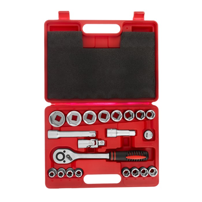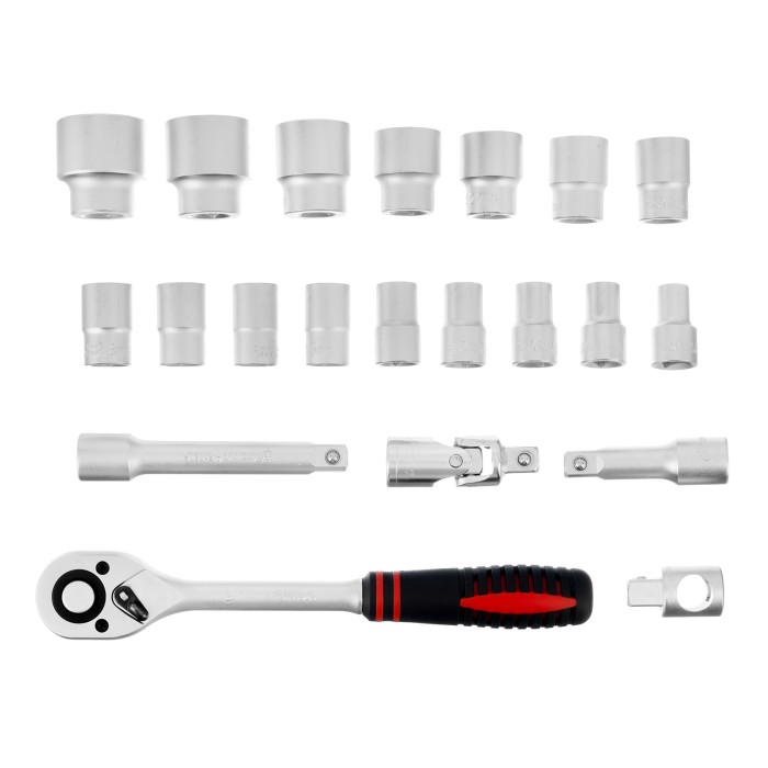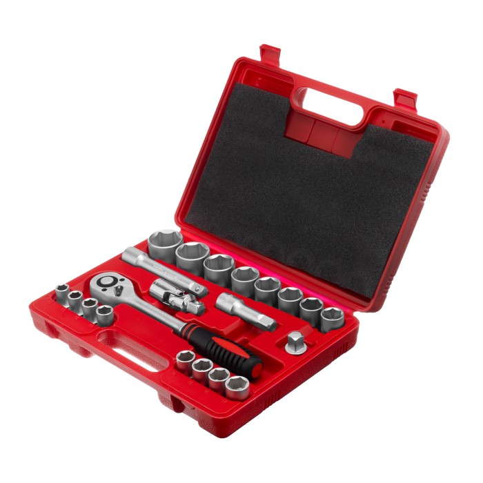 Ключ трещоточный - 1 штКардан - 1 штПереходник - 1 штУдлинители 75, 125 - 2 штГоловки 10, 11, 12, 13, 14, 15, 16, 7, 18, 19, 21, 22, 24, 27, 30, 32 - 16 штКейс - 1 штТрещотка - 1 шт