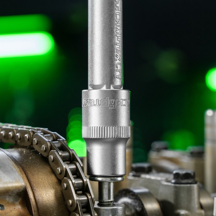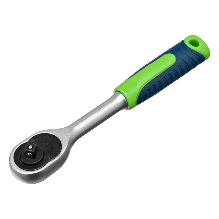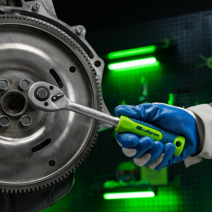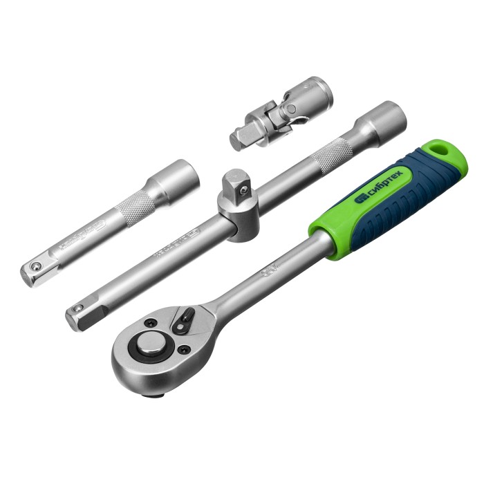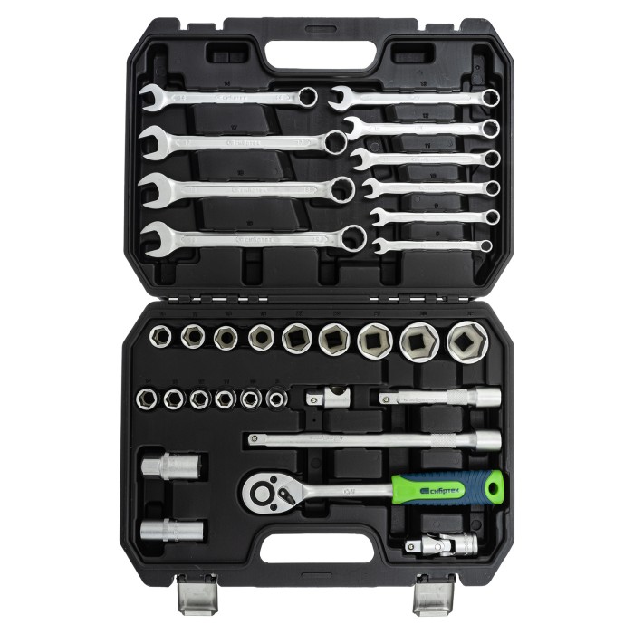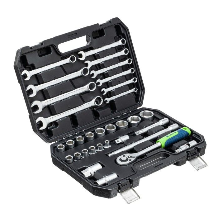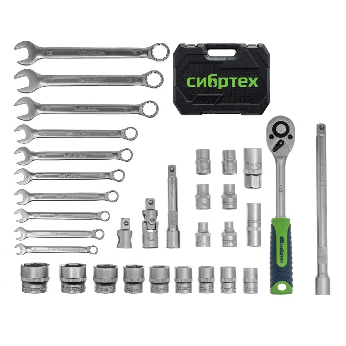 Набор инструментов Сибртех 13393, поставляющийся в пластиковом кейсе, состоит из 32 предметов с присоединительным размером 1/2", предназначенных для закручивания и откручивания резьбового крепежа. В комплект поставки входят 2 удлинителя и кардан, облегчающие работу в труднодоступных местах. Набор будет полезен для ремонта автомобиля в гараже, пригодится также и в быту.ПреимуществаИзносостойкость — элементы набора изготовлены из высокопрочной стали.Надежная защита от коррозии — на инструменты нанесено матовое хромовое покрытие.Комфортная и эффективная работа — ключи-трещотки с 45 зубьями оснащены механизмом быстрого сброса, переключателем реверса с металлическим флажком и двухкомпонентной рукояткой.Прочная фиксация — шариковый замок на трещотках, воротках, шарнирах и удлинителях надежно удерживает головки.Удобное хранение и транспортировка — инструменты и насадки упакованы в ударопрочный пластиковый кейс с металлическими замками.