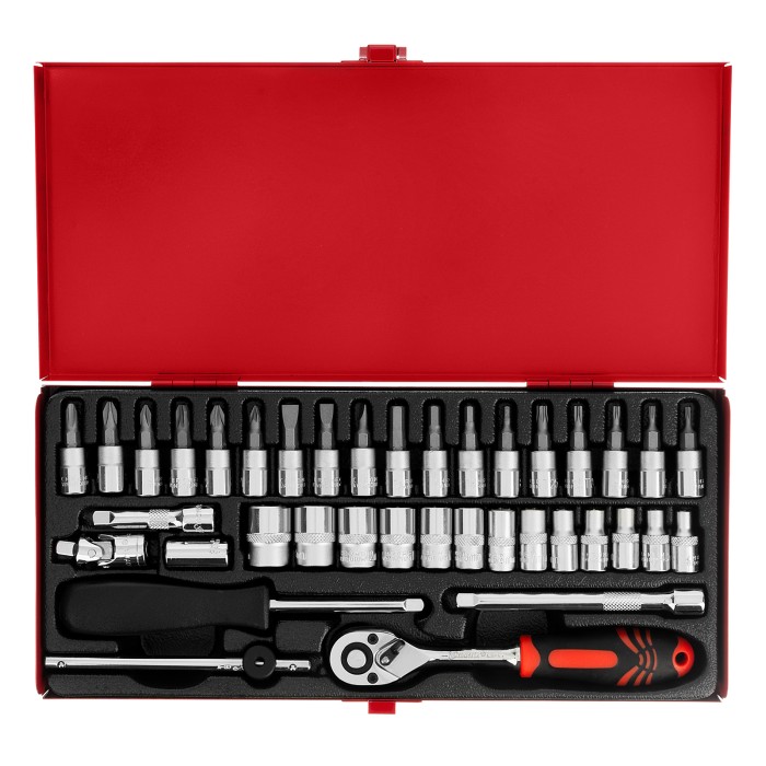 Ключ трещотка - 1 штГоловки 4, 4.5, 5, 5.5, 6, 7, 8, 9, 10, 11, 12, 13, 14 - 13 штКардан - 1 штУдлинитель 50, 100 - 2 штВороток Т-образный-отвертка - 1 штПереходник для бит - 1 штВороток Т-образный - 1 штБиты-вставки HEX, SL, PH, PZ, TORX - 18 штКейс - 1 штТрещотка - 1 шт
