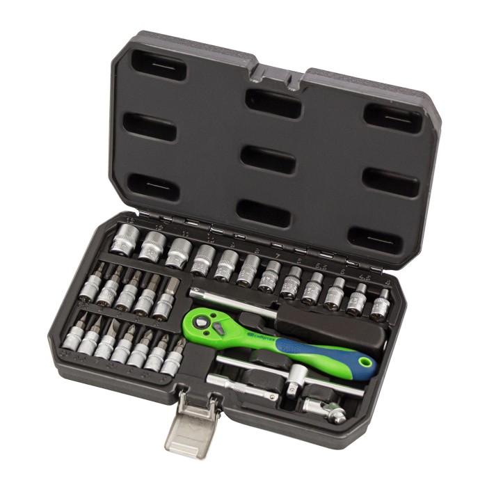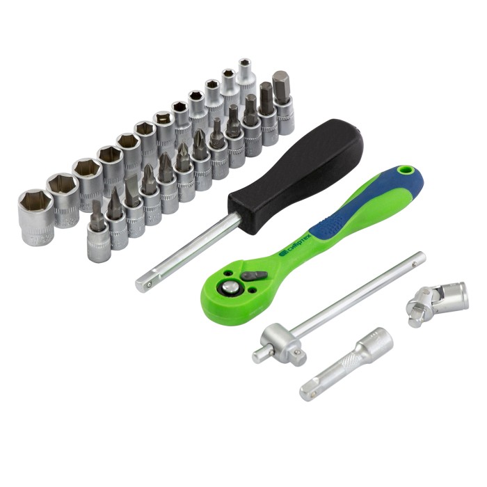 Набор инструментов Сибртех 13523, 1/4 дюйма, в пластиковом кейсе, состоит из 29 предметов, изготовленных из стали CrV-группы и использующихся для работы с резьбовыми соединениями. В комплекте имеются кардан, удлинитель и...