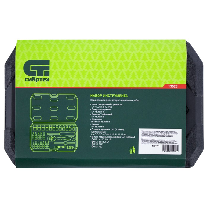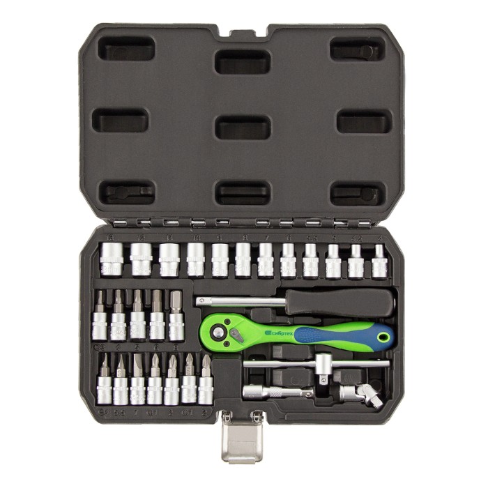 Набор инструментов Сибртех 13523, 1/4 дюйма, в пластиковом кейсе, состоит из 29 предметов, изготовленных из стали CrV-группы и использующихся для работы с резьбовыми соединениями. В комплекте имеются кардан, удлинитель и вороток, упрощающие работу в труднодоступных местах. Набор будет полезен автолюбителям и домашним мастерам.ПреимуществаИзносостойкость — элементы набора изготовлены из высокопрочной стали хромованадиевой группы.Устойчивость к коррозии — на инструменты нанесено защитное матовое покрытие.Возможность работать в стесненных условиях — шаг трещотки составляет всего 5 градусов.Комфортная работа одной рукой — трещоточный ключ снабжен флажковым переключателем направления движения.Защита от повреждений и химических воздействий — ключ-трещотка имеет полипропиленовое покрытие по всей длине корпуса.Удобное хранение и транспортировка — инструменты и насадки упакованы в ударопрочный пластиковый кейс с металлическими замками.