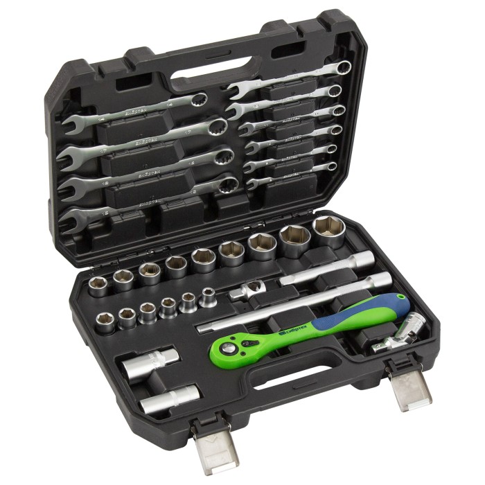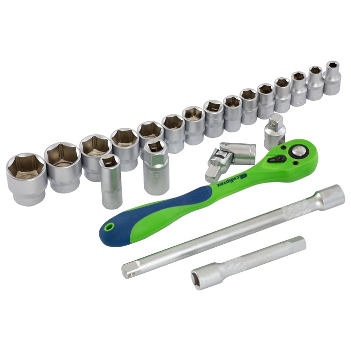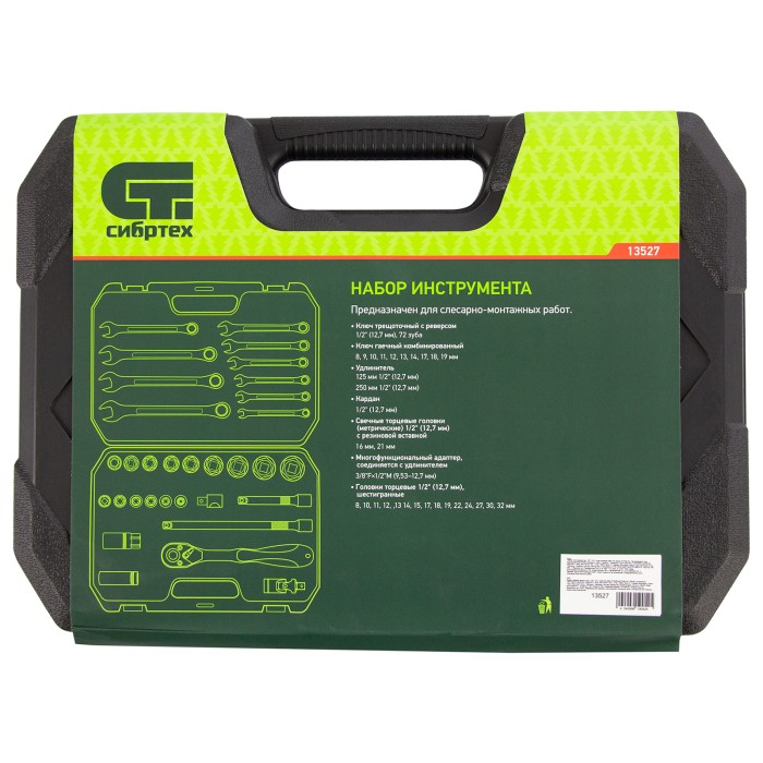 Набор инструментов Сибртех 13527, 1/2 дюйма, в пластиковом кейсе, состоит из 32 предметов, изготовленных из стали CrV-группы и предназначенных для закручивания и откручивания резьбовых крепежей. Имеющиеся в комплекте 2 удлинителя и кардан облегчают работу в труднодоступных местах. Набор будет полезен для ремонта автомобиля в гараже, пригодится также и в быту. ПреимуществаИзносостойкость — элементы набора изготовлены из высокопрочной стали хромованадиевой группы.Устойчивость к коррозии — на инструменты нанесено защитное матовое покрытие.Возможность работать в стесненных условиях — шаг трещотки составляет всего 5 градусов.Комфортная работа одной рукой — трещоточный ключ снабжен флажковым переключателем направления движения.Защита от повреждений и химических воздействий — ключ-трещотка имеет полипропиленовое покрытие по всей длине корпуса.Удобное хранение и транспортировка — инструменты и насадки упакованы в ударопрочный пластиковый кейс с металлическими замками.