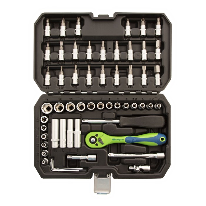 Набор инструментов Сибртех 13525, 1/4 дюйма, в пластиковом кейсе, состоит из 56 предметов, изготовленных из стали CrV-группы и предназначенных для закручивания и откручивания резьбовых крепежей. Имеющиеся в комплекте 2 у...