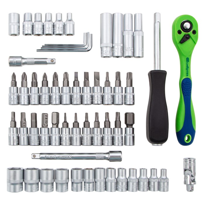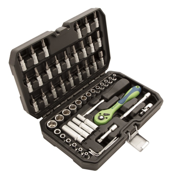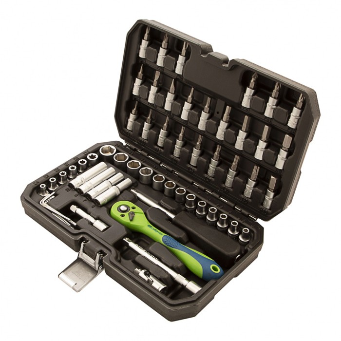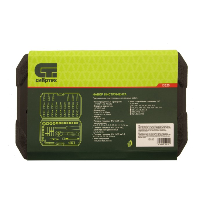 Набор инструментов Сибртех 13525, 1/4 дюйма, в пластиковом кейсе, состоит из 56 предметов, изготовленных из стали CrV-группы и предназначенных для закручивания и откручивания резьбовых крепежей. Имеющиеся в комплекте 2 удлинителя и кардан облегчают работу в труднодоступных местах. Набор будет полезен для ремонта автомобиля в гараже, пригодится также и в быту. ПреимуществаИзносостойкость — элементы набора изготовлены из высокопрочной стали хромованадиевой группы.Устойчивость к коррозии — на инструменты нанесено защитное матовое покрытие.Возможность работать в стесненных условиях — шаг трещотки составляет всего 5 градусов.Комфортная работа одной рукой — трещоточный ключ снабжен флажковым переключателем направления движения.Защита от повреждений и химических воздействий — ключ-трещотка имеет полипропиленовое покрытие по всей длине корпуса.Удобное хранение и транспортировка — инструменты и насадки упакованы в ударопрочный пластиковый кейс с металлическими замками.