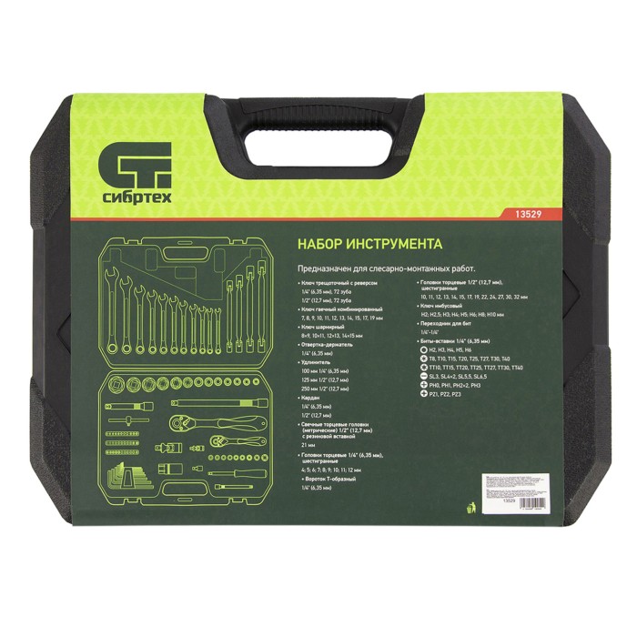 Набор инструментов Сибртех 13529 упакован в пластиковый кейс и состоит из 89 предметов из стали CrV, с присоединительными размерами 1/2" и 1/4". Предназначен для монтажа и демонтажа резьбового крепежа с разными типами шлицев. В комплект поставки входят карданы, удлинители и шарнирные ключи, облегчающие работу в труднодоступных местах. Набор используется для ремонта автомобилей, а также полезен в быту.ПреимуществаПрочность и износостойкость — элементы набора изготовлены из хромованадиевой стали, корпус каждого трещоточного ключа имеет защитное покрытие.Устойчивость к образованию коррозии — инструменты и насадки защищены специальным матовым покрытием.Плавная работа — храповые механизмы трещоток имеют 72 зуба.Комфортная работа одной рукой — направление вращения трещоток легко меняется при помощи переключателей с насечкой.Удобное хранение и транспортировка — набор упакован в ударопрочный пластиковый кейс с металлическими замками.