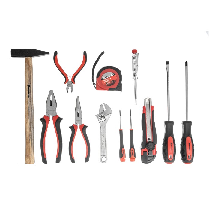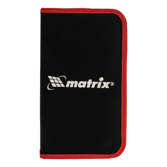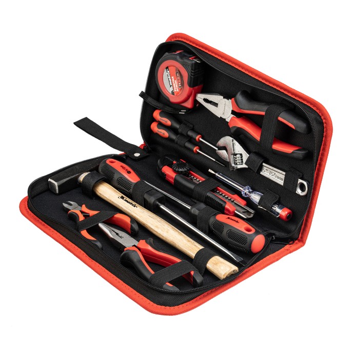 Набор Matrix 13562 из 12 предметов будет полезен как частному мастеру, так и профессионалу для проведения слесарно-монтажных работ. Он включает отвертки для монтажа/демонтажа резьбовых соединений, в том числе и мелких, разводной ключ для болтов и гаек, нож для резки плотных материалов, рулетку для проведения замеров, молоток, кусачки и тестер для проверки напряжения в сети.ПреимуществаПрочность и износостойкость — все детали набора изготовлены из инструментальной стали, рабочие части закалены до необходимой твердости.Безопасность — на длинногубцах и пассатижах имеются ограничительные упоры, благодаря которым пальцы не соскальзывают на рабочую часть.Магнитные свойства — наконечники отверток надежно фиксируются в головке крепежа.Сегментированное лезвие ножа — затупившиеся части легко отламываются, поэтому инструмент долго сохраняет режущую способность.Фиксация рулетки на запястье — в корпус встроен небольшой ремешок.Комфортная работа — инструменты имеют эргономичные двухкомпонентные рукоятки, рукоятка молотка выполнена из древесины и покрыта защитным лаком.Удобная транспортировка и хранение — набор поставляется в тканевом пенале на молнии.