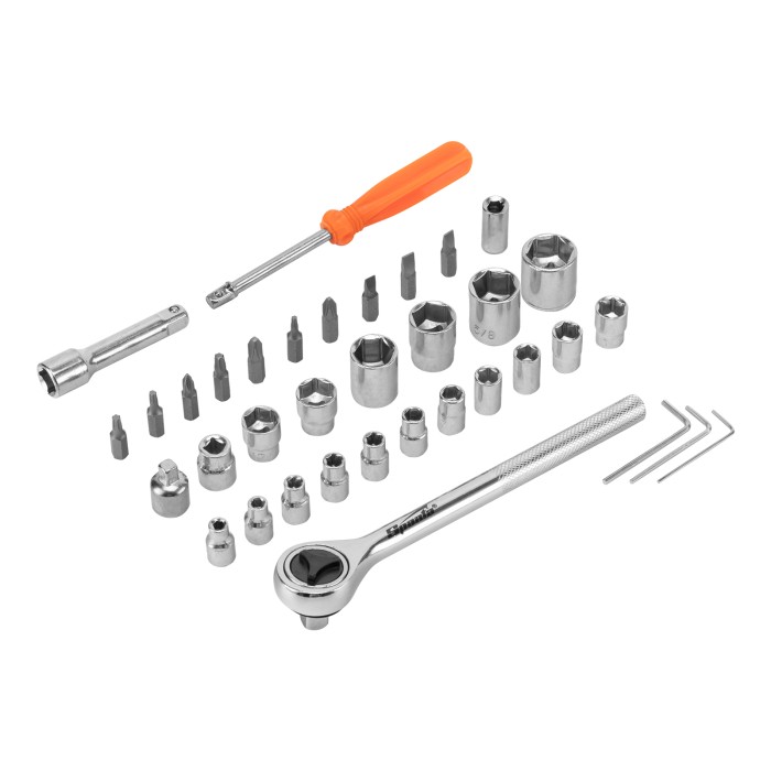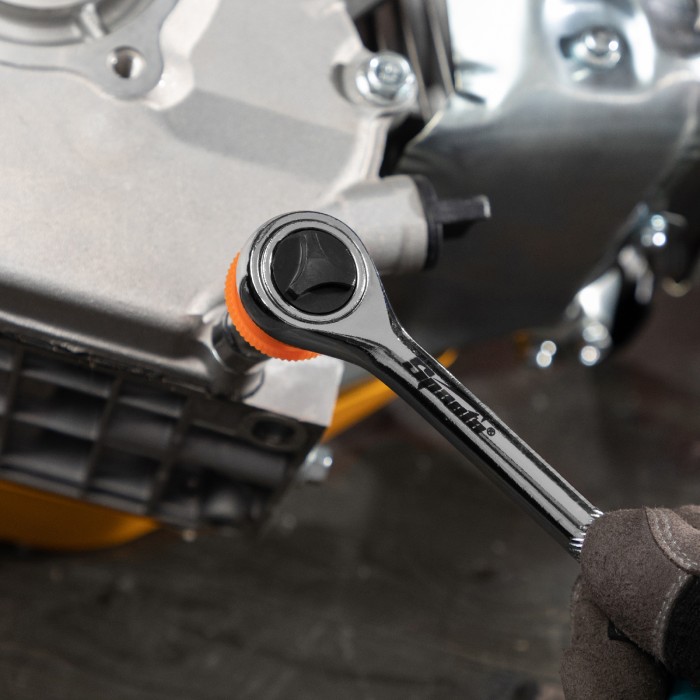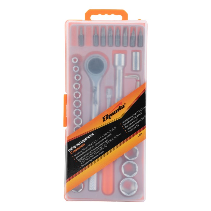 Набор Sparta 13541 содержит 37 предметов для проведения слесарно-монтажных работ. Он оптимально подходит для бытового применения, будет полезен начинающим мастерам. С помощью набора осуществляется монтаж/демонтаж резьбового крепежа.ПреимуществаИнструменты и сменные насадки выполнены из инструментальной стали и закалены, что обеспечивает им необходимые прочностные характеристики.Широкий ассортимент торцевых головок в наборе позволяет подобрать нужную в зависимости от крепежа.Реверсивная трещотка позволяет осуществлять монтаж и демонтаж резьбовых соединений.В комплект входит пластиковый диск для удобной эксплуатации реверсивной трещотки.Удлинитель на 3/8 дюйма обеспечивает доступ к резьбовым соединениям в труднодоступных местах.Ярко-оранжевый кейс с прозрачной крышкой позволяет удобно хранить и транспортировать набор, он не потеряется среди инструментов.