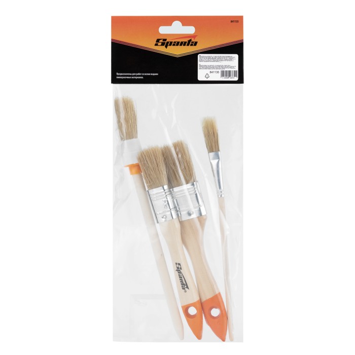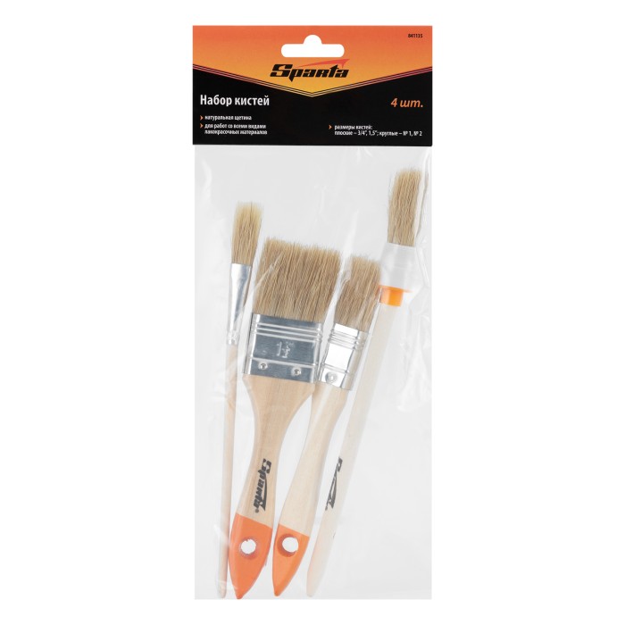 Набор Sparta 841135 включает в себя 4 кисти: плоские шириной 3/4″ (20 мм) и 1½″ (38) мм, круглую №2 (20 мм) и для декора №11. Предназначен для проведения покрасочных работ. Кисти с натуральной щетиной оптимальны для нанесения составов на основе растворителей, а также масляных красок. С их помощью можно получить равномерное финишное покрытие.ПреимуществаШирокие возможности — кисти удобны для работы на разных участках, в том числе узких и труднодоступных.Прочность и долговечность — металлический бандаж надежно фиксирует щетину, антикоррозийное покрытие защищает его от воздействия влаги.Улучшенные краскообменные свойства — щетина расщеплена на концах, что повышает впитываемость и отдачу ЛКМ.Удобное хранение — благодаря специальным отверстиям в рукоятках кисти можно подвешивать на крючок.