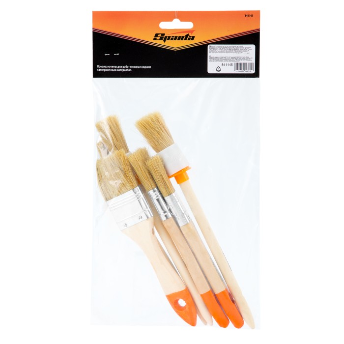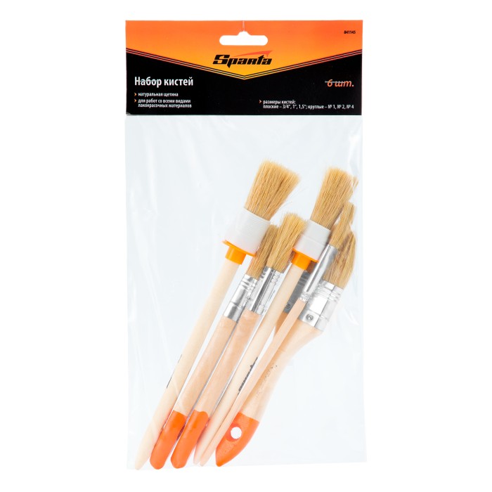 Набор Sparta 841145 включает в себя 6 кистей: плоские шириной 3/4″ (20 мм), 1″ (25 мм) и 1½″ (38 мм) круглые №1 (15 мм) и №2 (20 мм), а также для декора №11. Предназначен для проведения покрасочных работ. Кисти с натуральной щетиной оптимальны для нанесения составов на основе растворителей, а также масляных красок. С их помощью можно получить равномерное финишное покрытие.ПреимуществаШирокие возможности — кисти удобны для работы на разных участках, в том числе узких и труднодоступных.Прочность и долговечность — металлический бандаж надежно фиксирует щетину, антикоррозийное покрытие защищает его от воздействия влаги.Улучшенные краскообменные свойства — щетина расщеплена на концах, что повышает впитываемость и отдачу ЛКМ.Удобное хранение — благодаря специальным отверстиям в рукоятках кисти можно подвешивать на крючок.