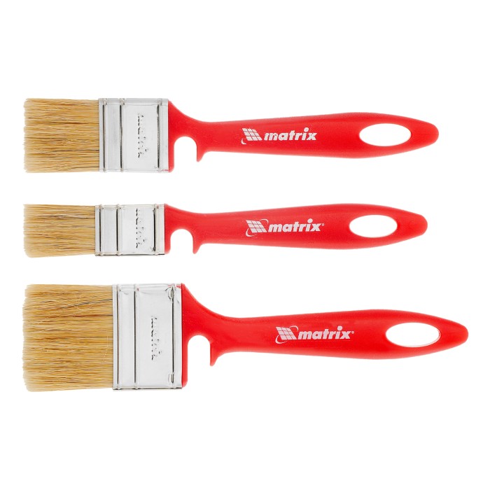Набор Matrix Color Line «ЭМАЛИ» 83355 включает флейцевые кисти шириной 25, 35 и 50 мм, предназначенные для работы с эмалями, в том числе на акриловой, алкидной основе, а также на основе растворителя. Натуральная щетина устойчива к износу и воздействию агрессивных жидкостей, а благодаря расщепленным концам хорошо впитывает и отдает краску. Высокая плотность щетины позволяет получить качественное покрытие. ПреимуществаРавномерное окрашивание — натуральная светлая щетина двойной выварки хорошо удерживает и распределяет краску.Долговечность — щетина надежно закреплена с помощью тщательно подобранной эпоксидной смолы, клиньев и бандажа, пластиковые клинья не деформируются при мытье или замачивании.Защита от разрушения — на бандажи нанесено антикоррозийное покрытие.Эргономичность — форма рукояток продумана таким образом, чтобы мастер не уставал даже при длительной работе, на каждой из них имеется специальный вырез, позволяющий зафиксировать кисть на малярном ведре или банке.Удобное хранение — в рукоятках имеются отверстия для подвешивания инструментов на крючок или гвоздь.