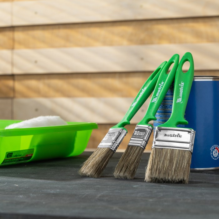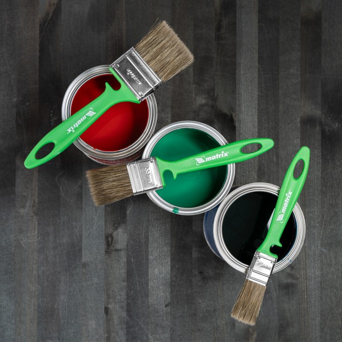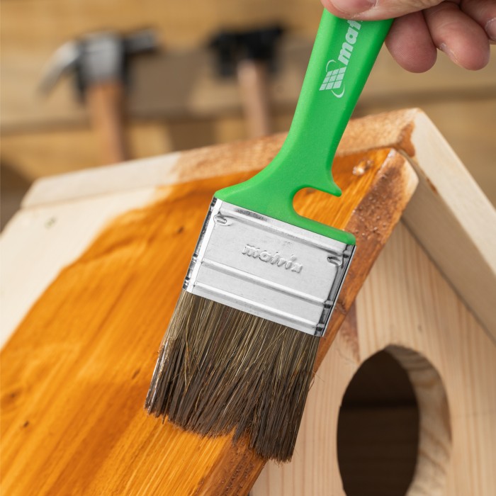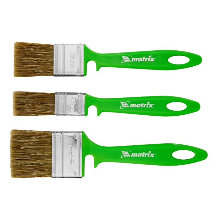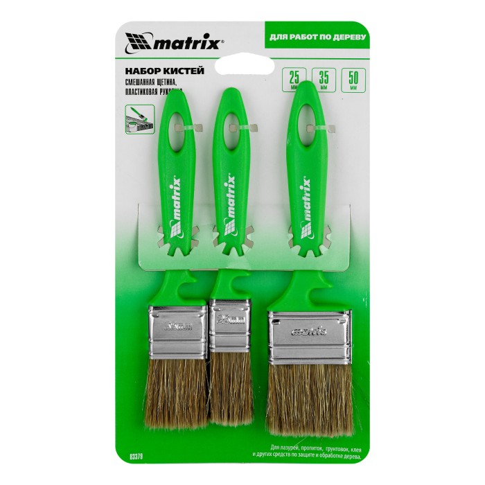 Набор Matrix Color Line «РАБОТЫ ПО ДЕРЕВУ» 83379 включает кисти шириной 25, 35 и 50 мм, использующиеся с любыми видами пропиток, клеев, грунтовок и других деревообрабатывающих составов. Комбинированная щетина расщеплена на кончиках и содержит натуральные волокна, поэтому кисти хорошо впитывают и отдают лакокрасочные материалы. Искусственный ворс предохраняет щетину от деформации при использовании водных составов. Высокая плотность щетины обеспечивает хорошую продуктивность работ.ПреимуществаДолговечность — щетина обладает высокой износостойкостью, клинья не подвержены воздействию воды и агрессивных ЛКМ, антикоррозионное покрытие предохраняет бандажи от разрушения.Возможность интенсивного применения — пластиковые клинья, эпоксидный клей уникальной рецептуры и прочные бандажи обеспечивают надежное скрепление щетины с рукоятками.Эргономичность — удобные рукоятки позволяют долго работать без ощущения усталости.Продуманная форма рукояток — благодаря специальному вырезу кисти можно закрепить на банке, ведре или ванночке.Хранение в вертикальном положении — в рукоятках предусмотрено отверстие для подвешивания кистей.