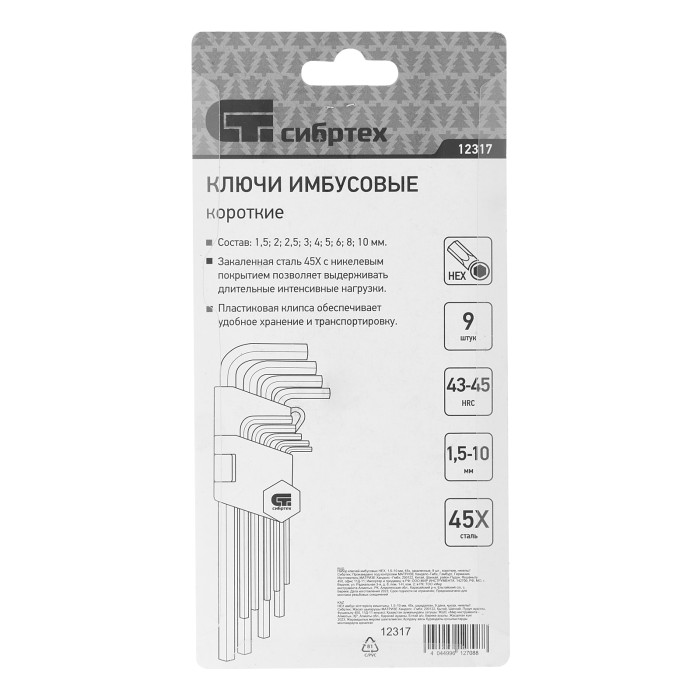 Набор ключей имбусовых HEX, 1.5-10 мм, 45x, закаленные, 9 шт, короткие, никель Сибртех
