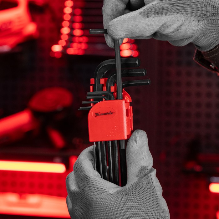 Набор Matrix 11231 из 9 удлиненных оксидированных имбусовых ключей размером 1,5-10 мм, из стали CrV, используется для монтажа и демонтажа крепежа со шлицем HEX. Шестигранники наиболее часто применяются для закручивания мебельных евровинтов и ремонта велосипедов. Удлиненные рабочие части обеспечивают удобный доступ в труднодоступные места.ПреимуществаВысокий ресурс — ключи изготовлены из прочной и износостойкой хромованадиевой стали.Коррозионная стойкость — оксидированное покрытие надежно защищает инструменты от разрушения.Универсальность — короткие части инструментов можно использовать для работы в ограниченном пространстве и в случаях, когда требуется приложить большое усилие.Продуманная комплектация — в набор входит удобный пластиковый держатель с отверстием для подвесного хранения.
