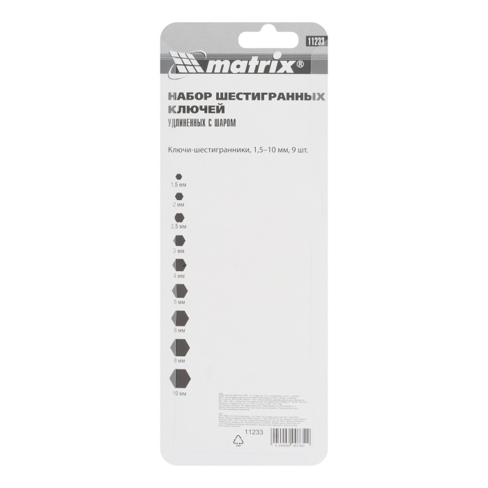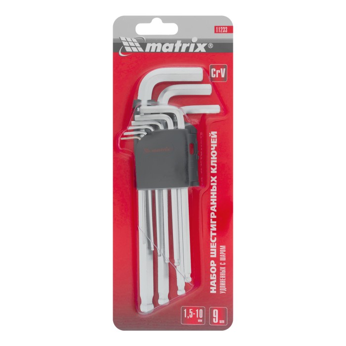 Набор ключей имбусовых HEX, 1.5-10 мм, CrV, 9 шт, удлиненные, сатин, с шаром Matrix