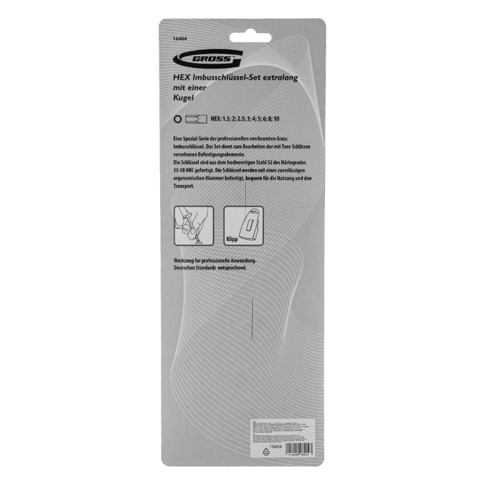 Набор Gross 16404 из стали S2 включает в себя 9 экстрадлинных сатинированных имбусовых ключей с шаром, предназначенных для закручивания и откручивания крепежа со шлицами HEX 1,5-10 мм. Благодаря увеличенной длине и Г-образной форме инструменты удобны для работы в труднодоступных местах, позволяют экономить усилия при монтаже и демонтаже крепежа. Набор пригодится для сборки мебели, ремонта велосипедов и т.д.ПреимуществаДолговечность — ключи изготовлены из инструментальной легированной стали S2, сатинированное покрытие защищает от механических повреждений и коррозии.Деформационная стойкость — инструменты закалены до необходимой твердости 52-56 HRC.Удобная работа в ограниченном пространстве — шарообразный наконечник обеспечивает надежный контакт с крепежом.Четкая маркировка — лазерное обозначение размеров и торговой марки упрощает подбор ключей и не стирается со временем.Комфортная работа и удобное хранение — набор поставляется в пластиковом чехле с клипсой для крепления на поясе.
