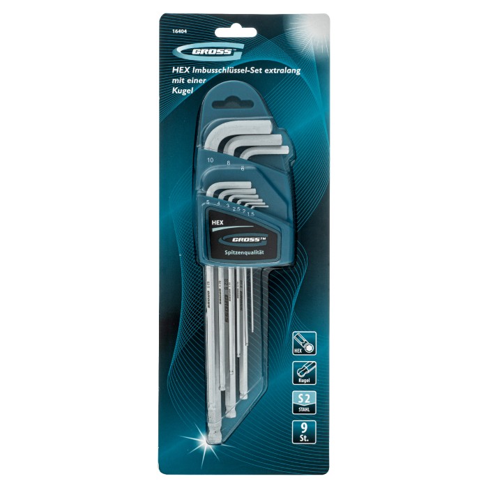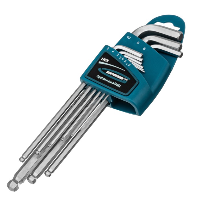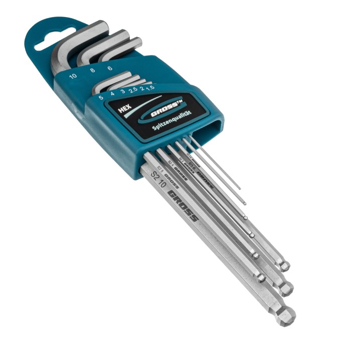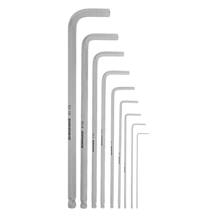 Набор ключей имбусовых HEX, 1.5-10 мм, S2, 9 шт, экстра-длинные с шаром, сатинированные Gross