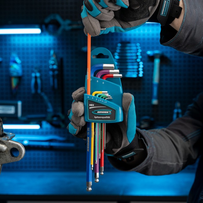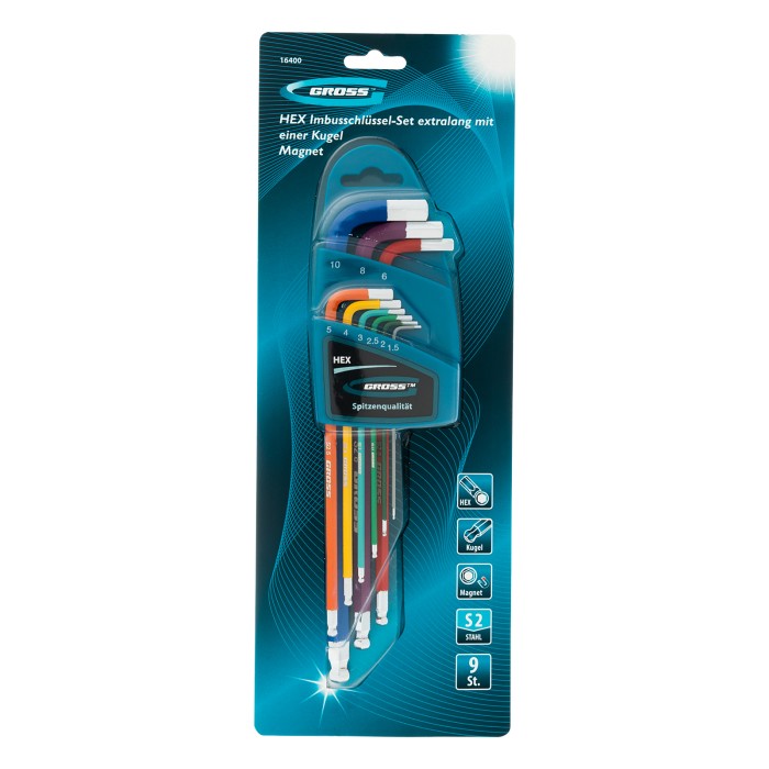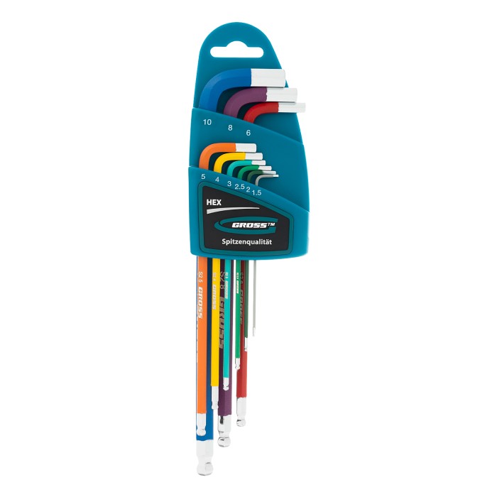 Набор экстрадлинных имбусовых ключей HEX Gross 16400 из стали S2, с шаром и магнитом, с покрытием хром/краска, включает 9 инструментов размером 1,5-10 мм и используется для работы с евровинтами, имеющими шестигранные шли...
