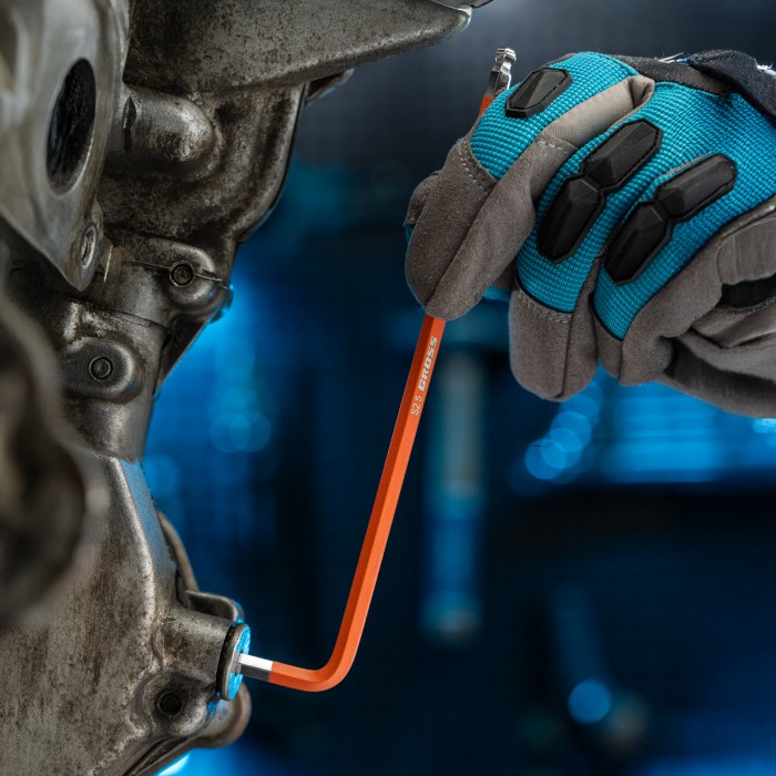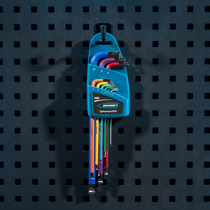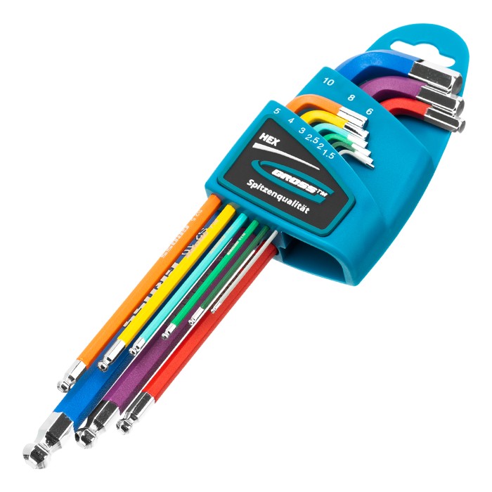 Набор экстрадлинных имбусовых ключей HEX Gross 16400 из стали S2, с шаром и магнитом, с покрытием хром/краска, включает 9 инструментов размером 1,5-10 мм и используется для работы с евровинтами, имеющими шестигранные шлицы. Ключи увеличенной длины облегчают действия в ограниченном пространстве, а также позволяют экономить усилия во время работы. Набор будет полезен во время проведения монтажных работ, сборки мебели и различных конструкций.ПреимуществаДолговечность — ключи изготовлены из высокопрочной легированной стали S2, порошковое покрытие защищает их от коррозии.Деформационная стойкость — инструменты закалены до необходимой твердости 52-56 HRC.Уверенный контакт с крепежом при работе под углом — в шаровидный наконечник каждого ключа встроен магнит.Быстрый поиск нужного инструмента — инструменты имеют разноцветное покрытие, на каждый методом лазерной гравировки нанесена маркировка с обозначением размера.Защита от подделок — на ключах выгравирована торговая марка.Комфортная работа и удобное хранение — набор поставляется в пластиковом чехле с клипсой для крепления на поясе.