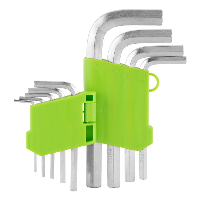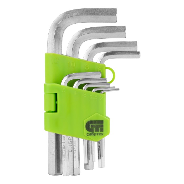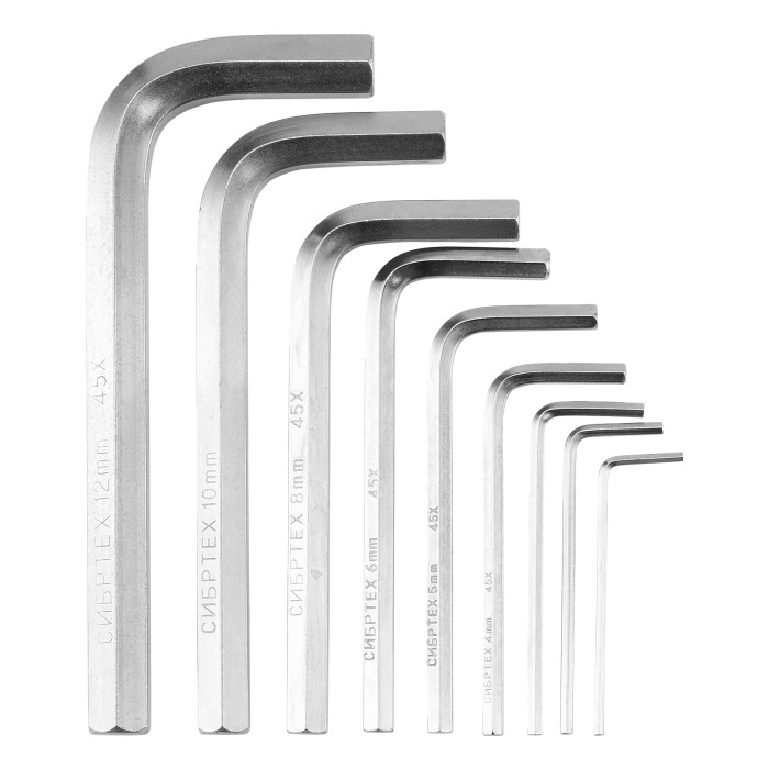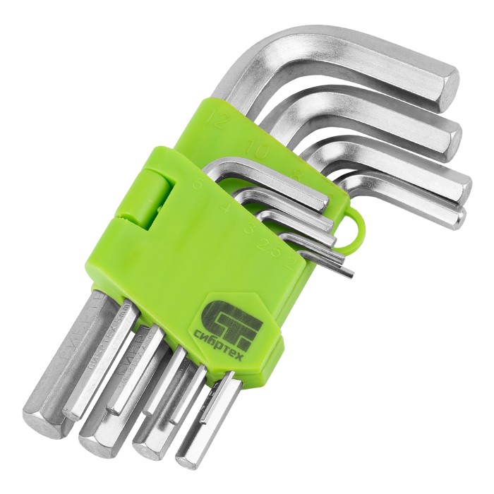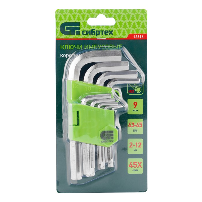 Набор ключей имбусовых HEX, 2-12 мм, 45x, закаленные, 9 шт, короткие, никель Сибртех