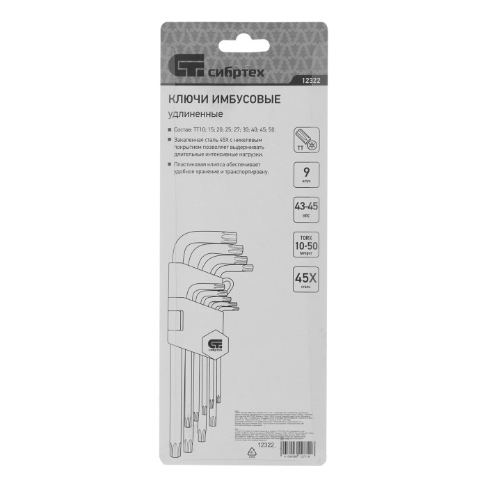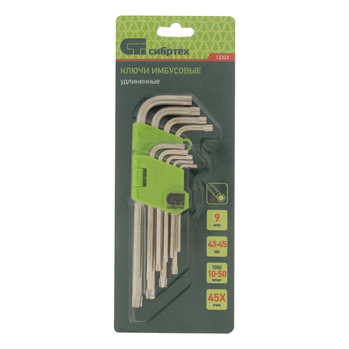 Набор Сибртех 12322 состоит из 9 удлиненных имбусовых ключей TT10-TT50, выполненных из закаленной стали 45Х. Предназначен для работы со специализированными крепежами, оснащенными шлицами Tamper-Torx. Ключи размером от TT10 до TT50 используются для разборки и сборки оборудования, защищенного от несанкционированного вмешательства пользователя, — например, аккумуляторных отсеков электроинструмента или бытовой техники.ПреимуществаУлучшенные прочностные характеристики — ключи изготовлены из углеродистой стали 45Х и закалены до твердости 45 HRC. Работа в труднодоступных местах — Г-образная форма позволяет использовать в качестве рабочей короткую часть инструмента.Устойчивость к коррозии — на ключи нанесено никелевое покрытие.Удобная транспортировка и хранение — набор комплектуется держателем в виде пластиковой клипсы.