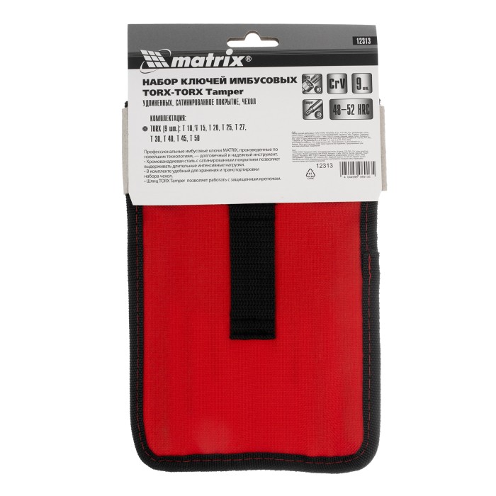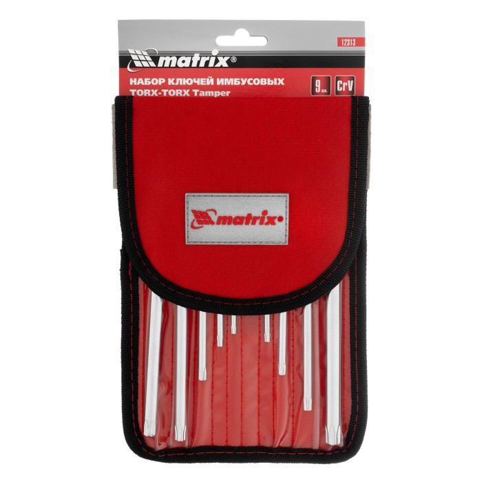 Набор Matrix 12313 в чехле включает 9 удлиненных сатинированных имбусовых ключей размером Т10-Т50, из стали CrV, и используется для монтажа и демонтажа крепежных элементов с профилем TORX-TORX Tampered. Набор пригодится для домашнего применения и профессиональных работ по ремонту бытовой и электронной техники. Ключи Г-образной формы удобны для работы с большим усилием и в труднодоступных местах.ПреимуществаВысокий ресурс — ключи изготовлены из прочной стали CrV твердостью 50-55 HRC.Универсальность — в набор входит 9 ключей для работы с крепежом разного типоразмера.Комфортная работа — сатинированные ключи с гладкой поверхностью без микронеровностей надежно ложатся в руку.Удобное хранение и транспортировка — ключи поставляются в тканевом чехле с застежкой, который можно закрепить на поясе.