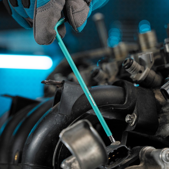 Набор ключей имбусовых экстрадлинных Gross 16402 из стали S2, с магнитом и покрытием хром/краска, включает в себя 9 инструментов размером T10-T50 мм. Используется для работы с крепежом, имеющим шлицы Torx и Tamper-Torx. Ключи увеличенной длины облегчают работу в ограниченном пространстве, а также позволяют экономить прикладываемые усилия. Набор будет полезен при ремонте электроприборов, велосипедов, автомобильной техники.ПреимуществаДолговечность — ключи изготовлены из высокопрочной легированной стали S2, порошковое покрытие защищает их от коррозии.Деформационная стойкость — инструменты закалены до необходимой твердости 52-56 HRC.Уверенный контакт с крепежом — в наконечник каждого ключа встроен магнит.Быстрый поиск нужного инструмента — каждый инструмент имеет свой цвет и маркировку с обозначением размера, нанесенную методом лазерной гравировки.Высокое качество — на ключах выгравирована торговая марка для защиты от подделок.Комфортная работа и удобное хранение — набор поставляется в пластиковом чехле с поясной клипсой.