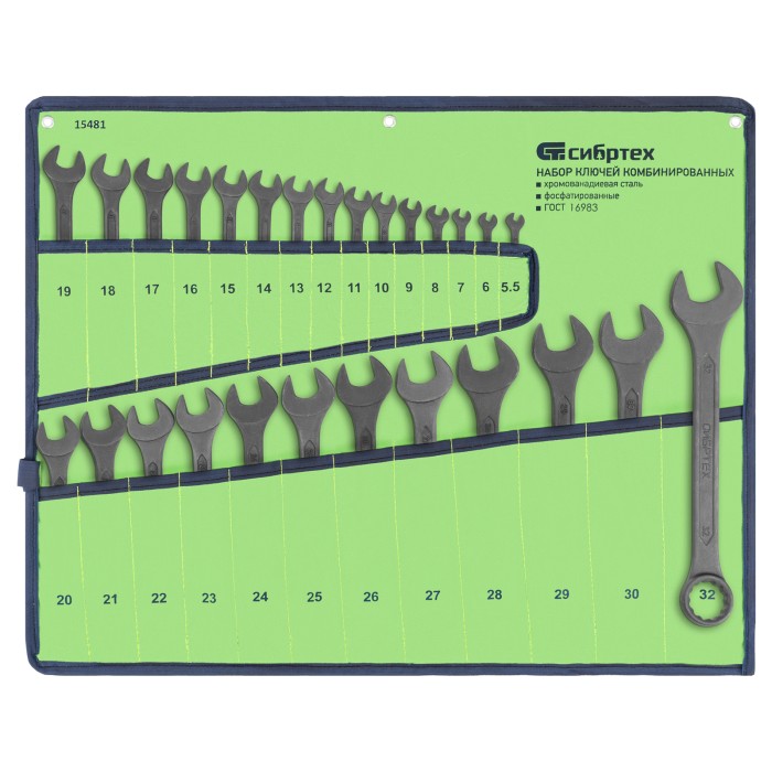 Набор комбинированных ключей Сибртех 15481 включает 27 инструментов из стали CrV, с фосфатированной поверхностью, соответствующих ГОСТ 16983, и предназначен для откручивания и закручивания крепежа размером 5,5-32 мм с 6-...