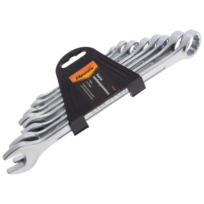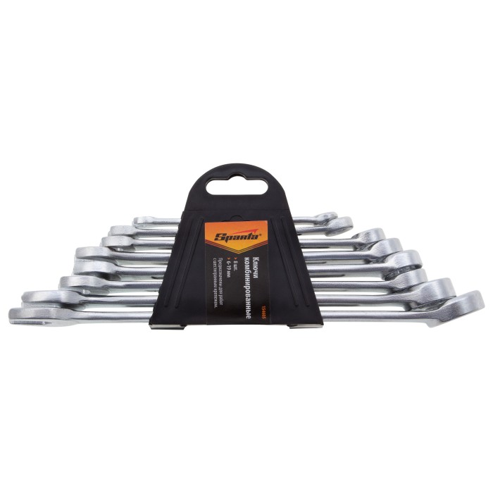 Набор хромированных комбинированных ключей Sparta 154605 состоит из 8 слесарно-монтажных инструментов для работы с резьбовыми соединениями размером от 6 до 19 мм. 12-гранная накидная головка каждого ключа обеспечивает надежный контакт с поверхностью крепежа, а рожковый зев дает возможность работать там, где применение кольцевого затруднено. Ключи пригодятся в мастерской, гараже, будут полезны во время строительства и ремонта.ПреимуществаПрочность и высокий ресурс — ключи изготовлены из углеродистой стали 45, твердость рабочих частей составляет 42 HRC (в полном соответствии с требованиями ГОСТ).Защита от разрушения — хромированные поверхности не подвержены коррозии.Удобный монтаж в труднодоступных местах — кольцевые головки смещены на 15° относительно плоскости ключей.