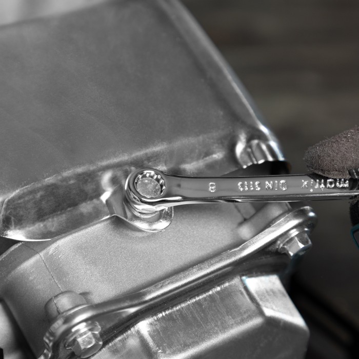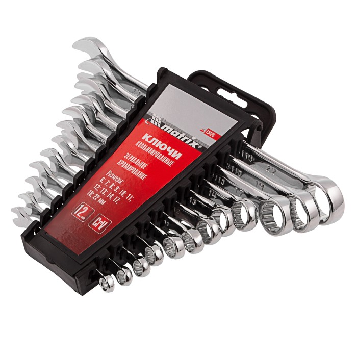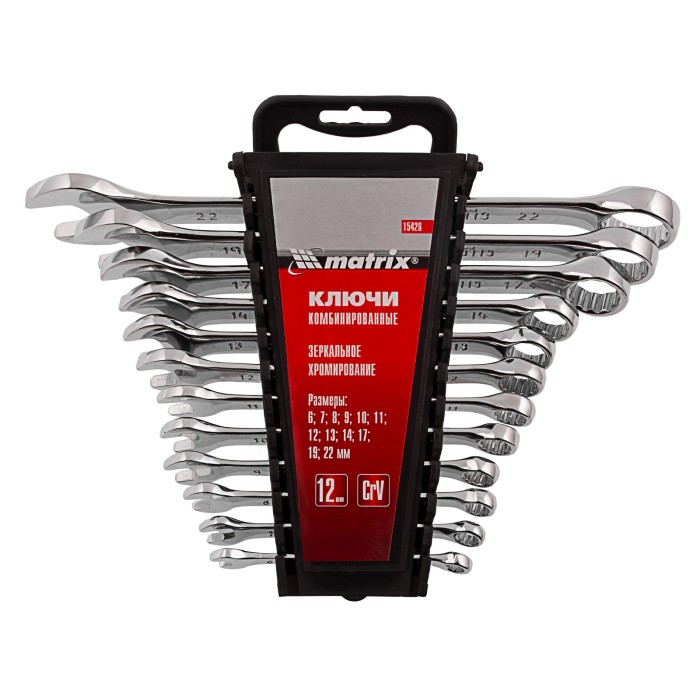 Набор Matrix 15426 включает 12 комбинированных ключей из стали CrV, размером 6-22 мм, с покрытием «полированный хром», которые пригодятся во время ремонтных работ дома или в гараже. С их помощью можно быстро монтировать и демонтировать крепежные элементы. В набор входят инструменты основных типоразмеров, позволяющие эффективно решать поставленные задачи.ПреимуществаВысокая деформационная стойкость — ключи изготовлены из хромованадиевой стали, а рабочие части закалены до твердости 45 HRC.Защита от разрушения — полированное хромоникелевое покрытие предотвращает образование коррозии.Аккуратная работа — накидные части с 12-гранным профилем охватывают всю поверхность крепежа, уменьшая риск деформации его граней.Комфортная работа в ограниченном пространстве — угол наклона кольцевых зевов относительно плоскости инструментов составляет 15°, что делает монтаж крепежа более удобным.Удобный пластиковый держатель — ключи не потеряются во время хранения и транспортировки.