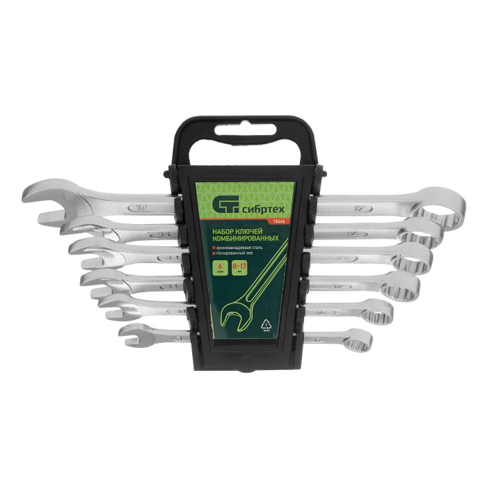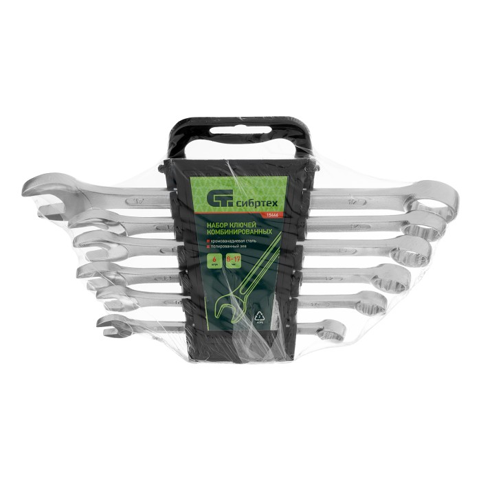 Набор комбинированных ключей Сибртех 15446 включает в себя 6 инструментов из стали CrV для работы с резьбовыми крепежами диаметром от 8 до 17 мм. Каждый ключ снабжен рожковым и 12-гранным кольцевым зевом, который максимально плотно соприкасается с поверхностью гайки или болта — это уменьшает риск ее деформации. Набор незаменим при ремонте автомобиля, а также будет полезен для сборки техники или решения бытовых задач.ПреимуществаВысокая прочность — ключи изготовлены из стали хромованадиевой группы, а рабочие части закалены до твердости 45 HRC (в полном соответствии с требованиями ГОСТ).Долгий срок службы — хромированное покрытие защищает инструменты от коррозии и механических повреждений.Комфортная работа — накидные головки наклонены под углом 15° к плоскости ключей.Удобное хранение и извлечение инструментов — набор поставляется в пластиковом держателе.