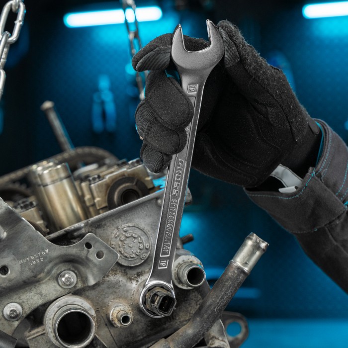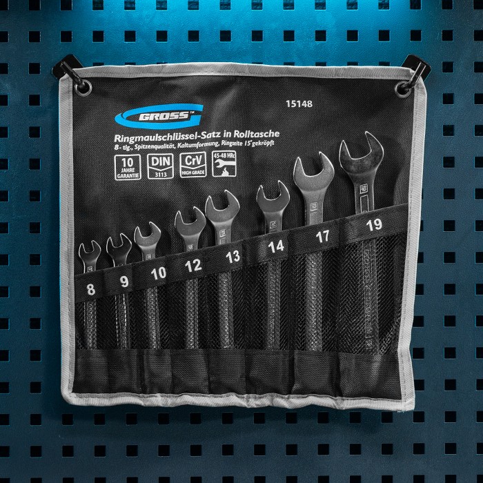 Набор комбинированных ключей Gross 15148 из 8 шт. размером от 8 до 19 мм, холодный штамп, — комплект ручных слесарно-монтажных инструментов из стали CrV, позволяющих закручивать и откручивать гаечные и болтовые соединени...